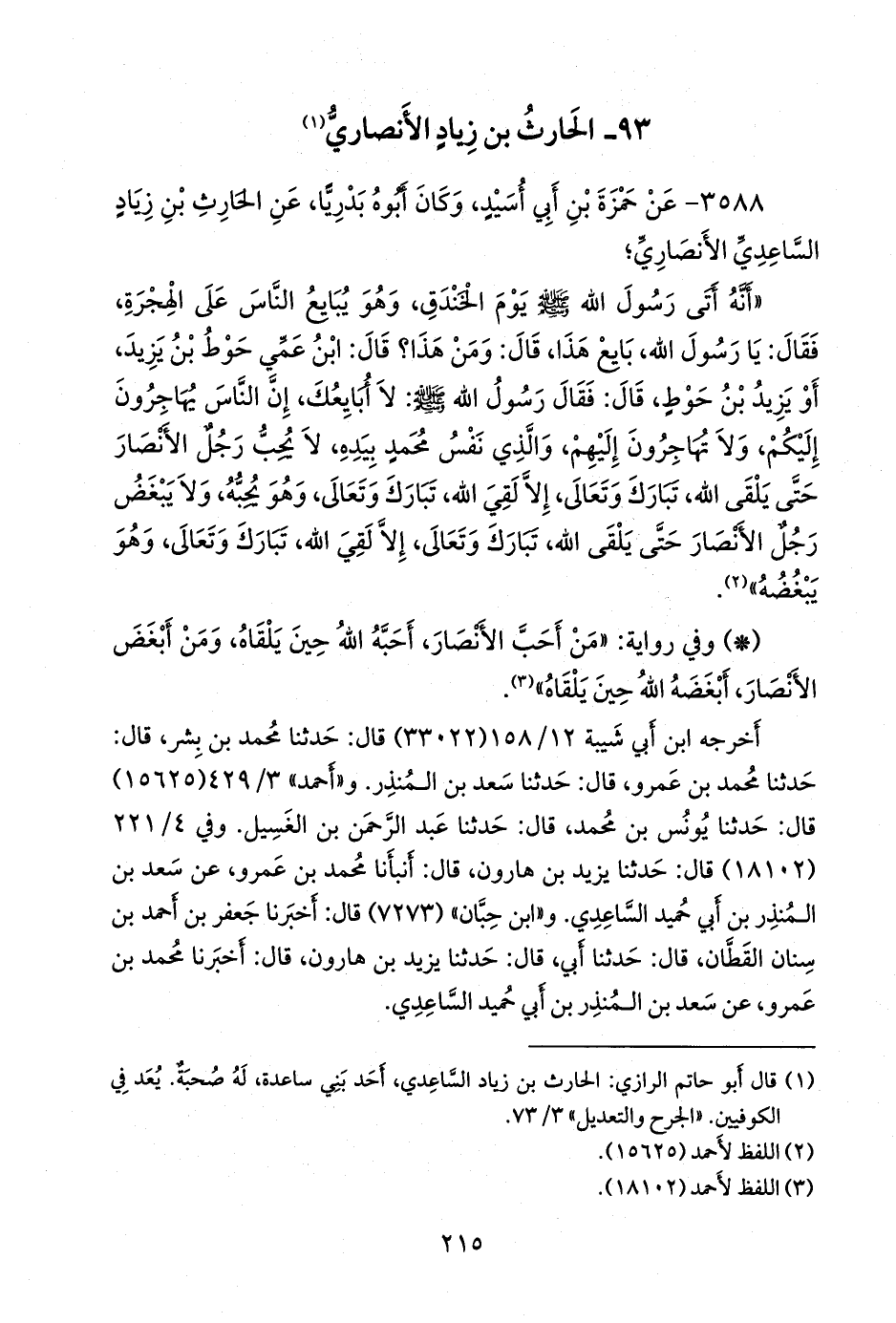 (¬١) قال أَبو حاتم الرازي: الحارث بن زياد الساعدي، أحد بني ساعدة، له صحبة. يعد في الكوفيين. «الجرح والتعديل» ٣/ ٧٣.