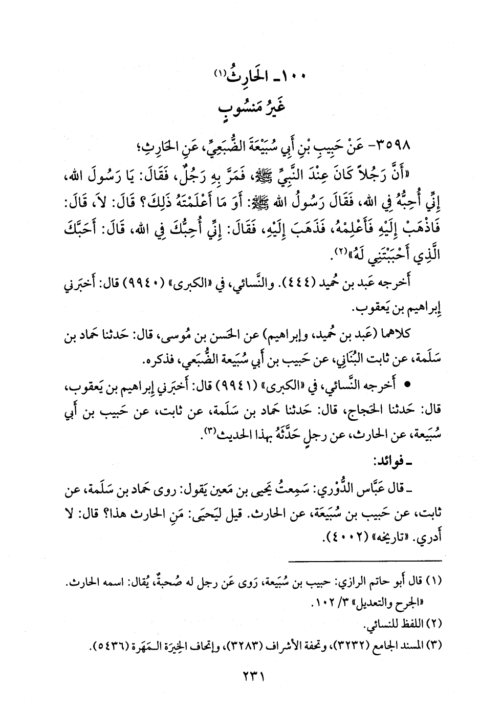 - وقال المِزِّي: حبيب بن أَبي سُبَيعة الضُّبَعي، وقيل: حبيب بن سُبَيعة، وقيل: سُبَيعة بن حبيب، عن الحارث؛ أَن رجلًا كان عند النبي صَلى الله عَليه وسَلم فمَرَّ به رجلٌ، فقال: يا رسول الله، إِني أُحبه في الله، الحديثَ، وقيل: عن الحارث، عن رجلٍ حدثه بهذا الحديث. «تهذيب الكمال» ٥/ ٣٧٥.