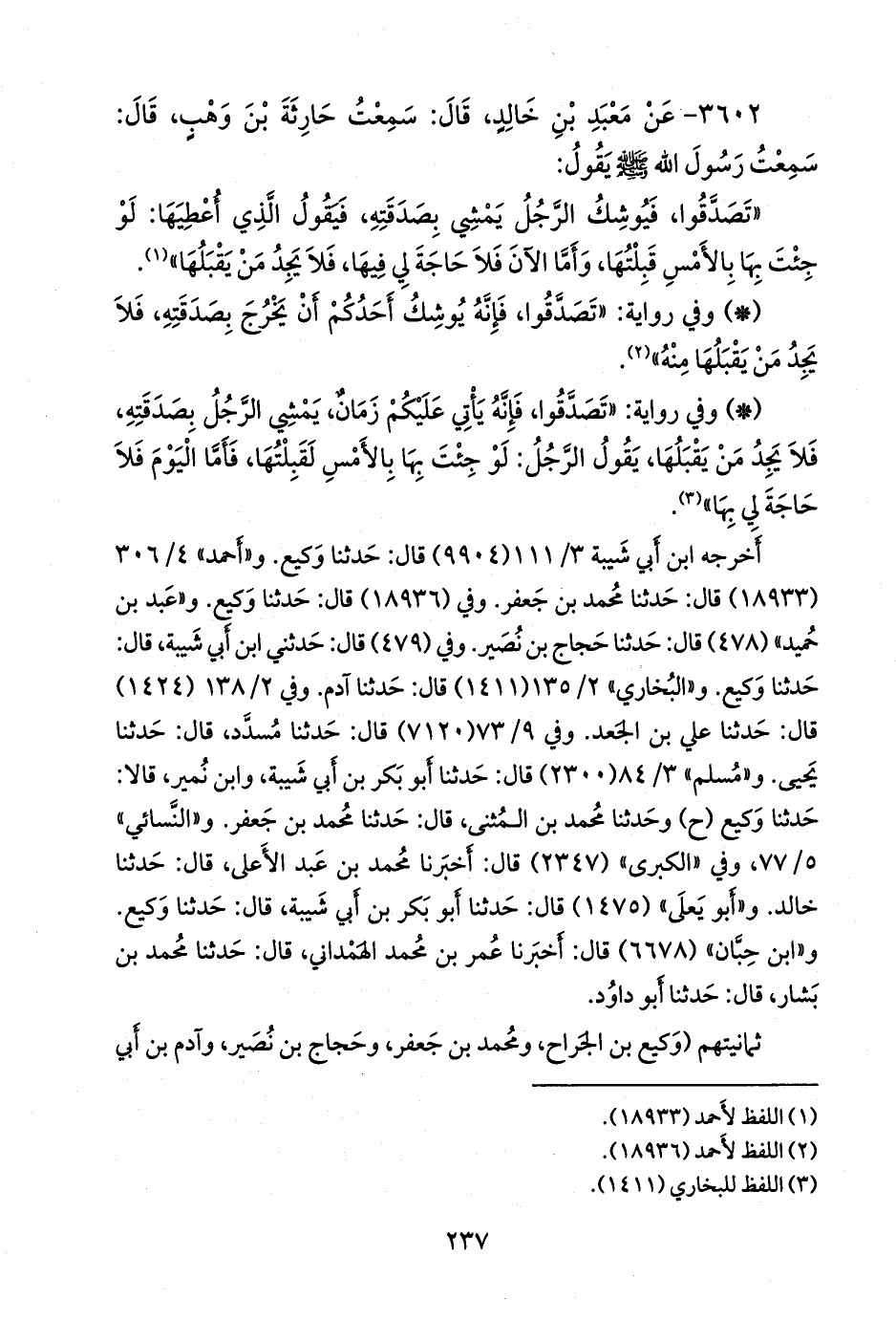 - وفي رواية: «تصدقوا، فإنه يأتي عليكم زمان، يمشي الرجل بصدقته، فلا يجد من يقبلها، يقول الرجل: لو جئت بها بالأمس لقبلتها، فأما اليوم فلا حاجة لي بها» (¬٣).
