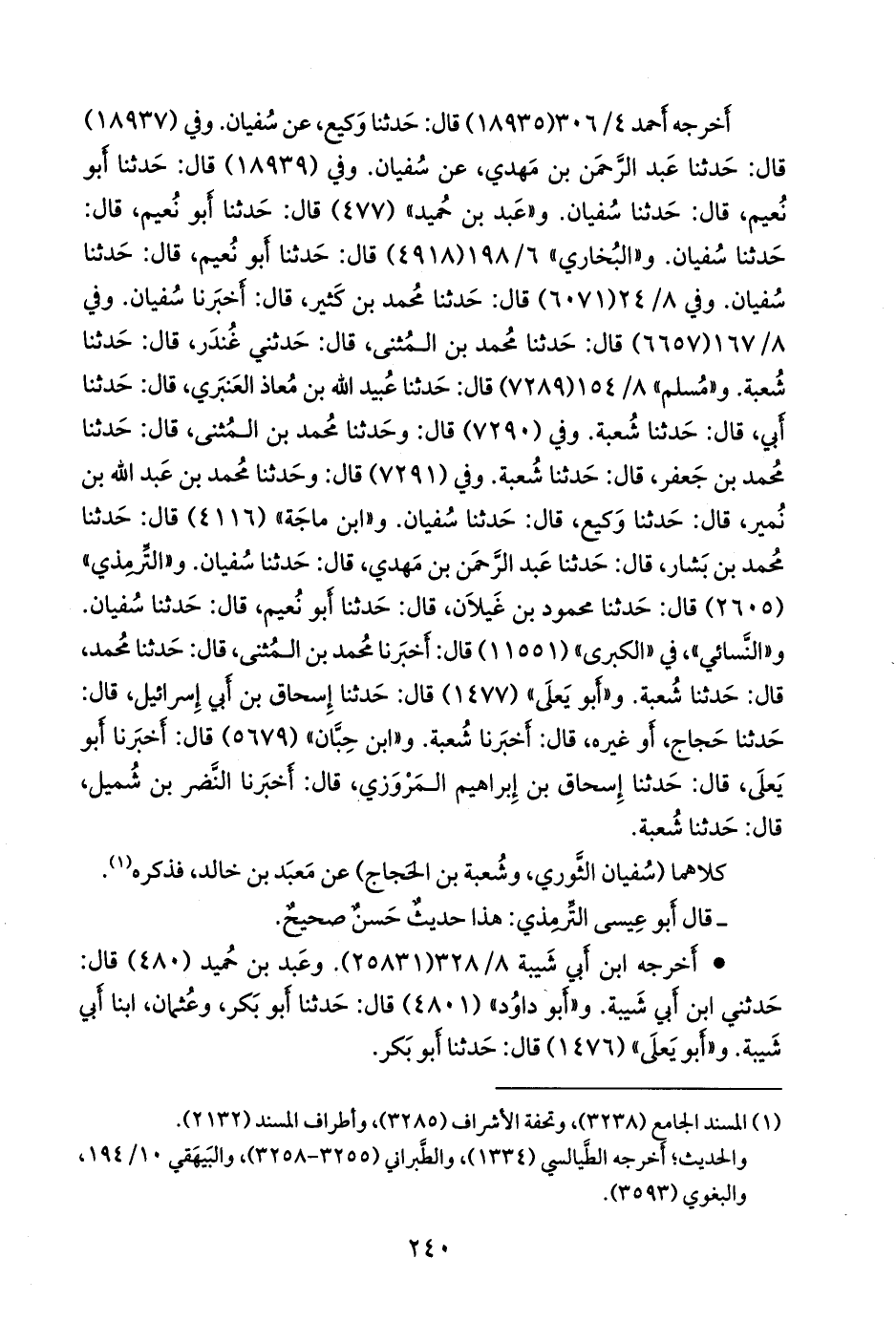 وفي (٧٢٩١) قال: وحدثنا محمد بن عبد الله بن نُمير، قال: حدثنا وكيع، قال: حدثنا سفيان. و «ابن ماجة» (٤١١٦) قال: حدثنا محمد بن بشار، قال: حدثنا عبد الرَّحمَن بن مهدي، قال: حدثنا سفيان. و «التِّرمِذي» (٢٦٠٥) قال: حدثنا محمود بن غَيلان، قال: حدثنا أَبو نُعيم، قال: حدثنا سفيان. و «النَّسَائي» في «الكبرى» (١١٥٥١) قال: أخبرنا محمد بن المثنى، قال: حدثنا محمد، قال: حدثنا شعبة. و «أَبو يَعلى» (١٤٧٧) قال: حدثنا إسحاق بن أبي إسرائيل، قال: حدثنا حجاج، أو غيره، قال: أخبرنا شعبة. و «ابن حِبَّان» (٥٦٧٩) قال: أخبرنا أَبو يَعلى، قال: حدثنا إسحاق بن إبراهيم المَرْوَزي، قال: أخبرنا النضر بن شميل، قال: حدثنا شعبة.