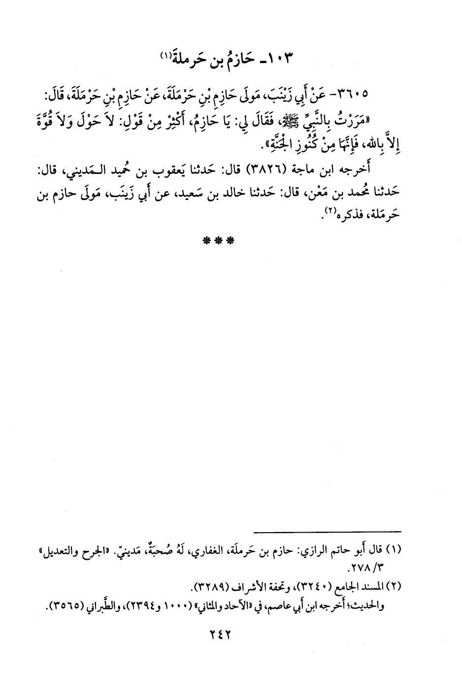 «مررت بالنبي صَلى الله عَليه وسَلم فقال لي: يا حازم، أكثر من قول: لا حول ولا قوة إلا بالله، فإنها من كنوز الجنة».