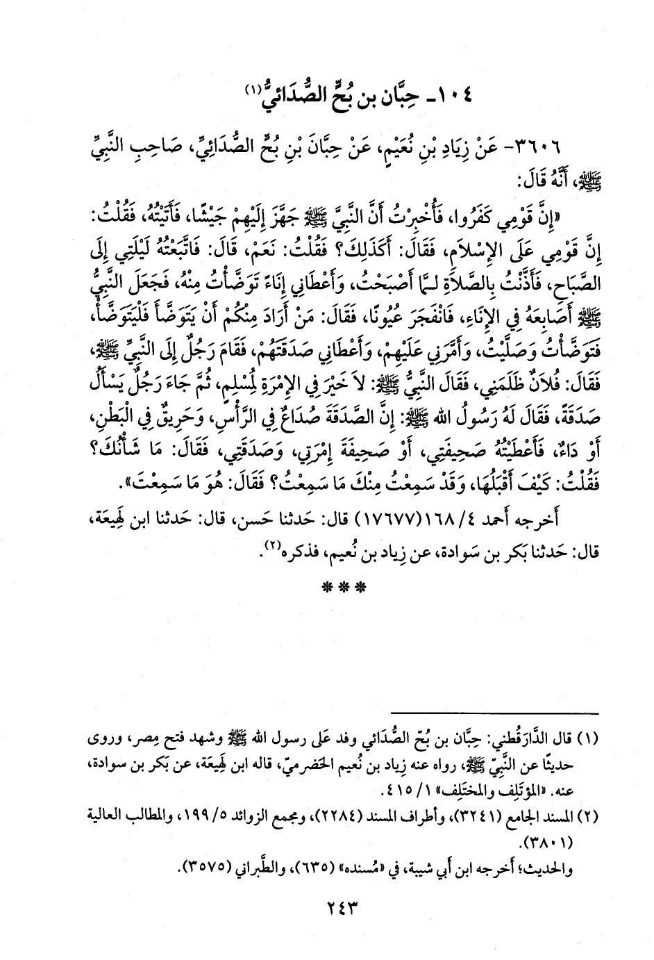٣٦٠٦ - عَنْ زِيَادِ بْنِ نُعَيْمٍ، عَنْ حِبَّانَ بْنِ بُحٍّ الصُّدَائِيِّ، صَاحِبِ النَّبِيِّ صَلى الله عَليه وسَلم أَنَّهُ قَالَ: