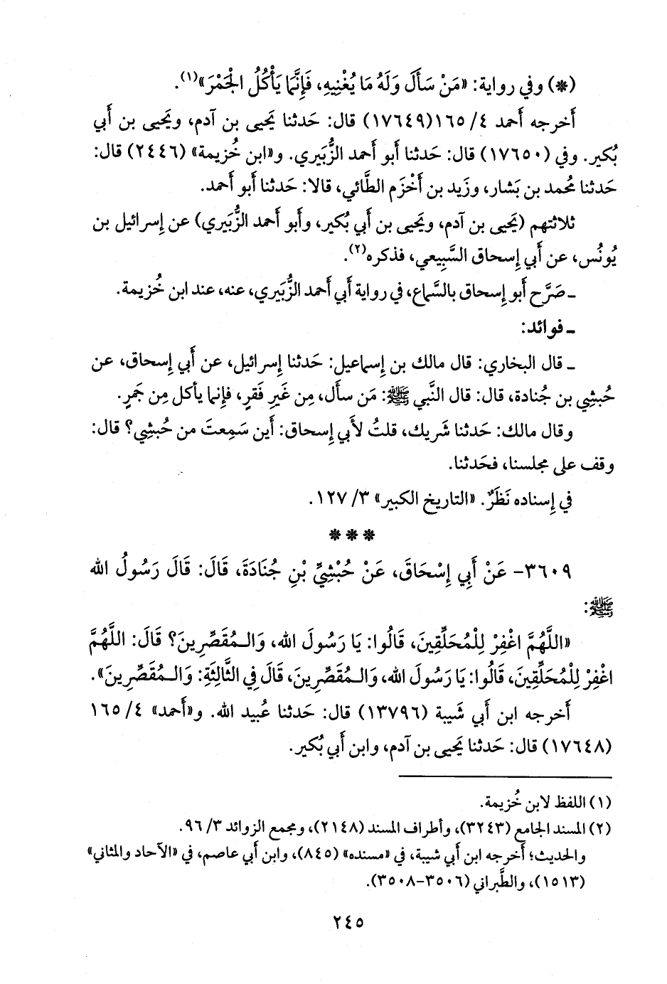 - قلنا: قال البخاري: قال مالك بن إسماعيل: حدثنا إسرائيل، عن أبي إسحاق، عن حبشي بن جنادة، قال: قال النبي صَلى الله عَليه وسَلم: من سأل، من غير فقر، فإنما يأكل من جمر.