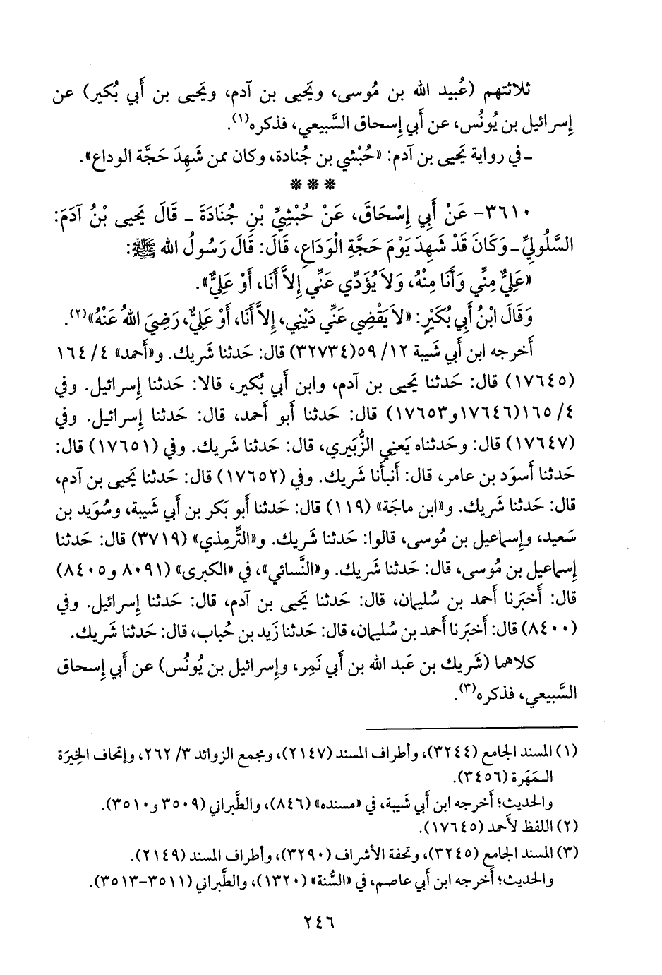 ٣٦١٠ - عن أبي إسحاق، عن حبشي بن جنادة ـ قال يحيى بن آدم: السلولي، وكان قد شهد يوم حجة الوداع، قال: قال رسول الله صَلى الله عَليه وسَلم: