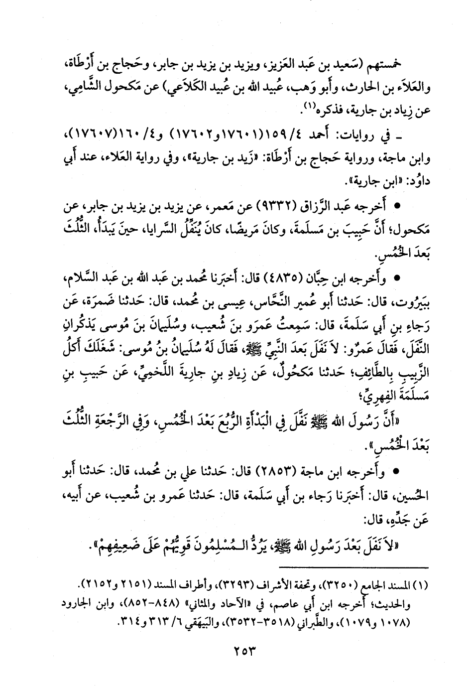 - لفظ (١٧٦٠٨): «شهدت رسول الله صَلى الله عَليه وسَلم نفل الربع بعد الخمس، في البدأة، والثلث في الرجعة».