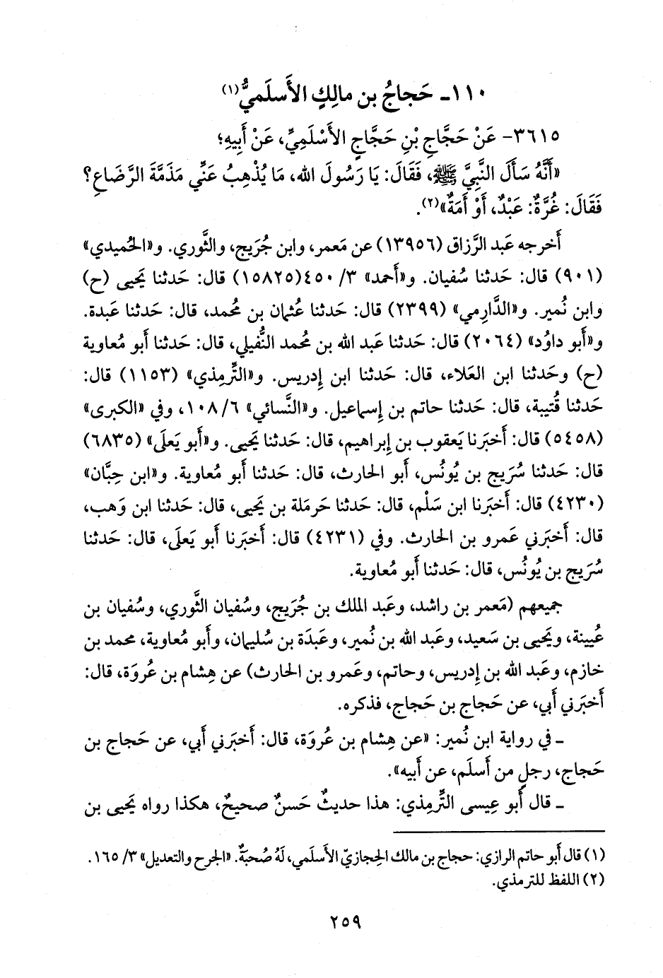 - أَخرجه النَّسَائي في «الكبرى» (٥٤٥٩) قال: أخبرنا إسحاق بن منصور الكوسج المَرْوَزي، قال: حدثنا عبد الرَّحمَن، يعني ابن مهدي، عن سفيان، عن هشام بن عروة، عن أبيه، عن حجاج الأسلمي، قال: