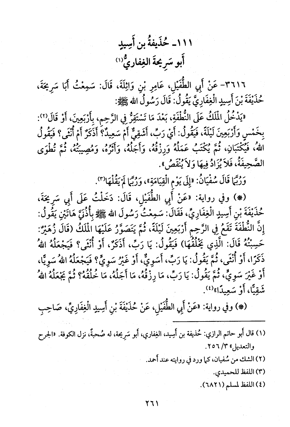 - وفي رواية: «عن أبي الطفيل، قال: دخلت على أبي سَرِيحة، حذيفة بن أَسِيد الغِفاري، فقال: سمعت رسول الله صَلى الله عَليه وسَلم بأذني هاتين يقول: إن النطفة تقع في الرحم أربعين ليلة، ثم يتصور عليها الملك (قال زهير: حسبته قال: الذي يخلقها) فيقول: يا رب، أذكر، أو أنثى؟ فيجعله الله ذكرا، أو أنثى، ثم يقول: يا رب، أسوي، أو غير سوي؟ فيجعله الله سويا، أو غير سوي، ثم يقول: يا رب، ما رزقه، ما أجله، ما خلقه؟ ثم يجعله الله شقيا، أو سعيدا» (¬٤).