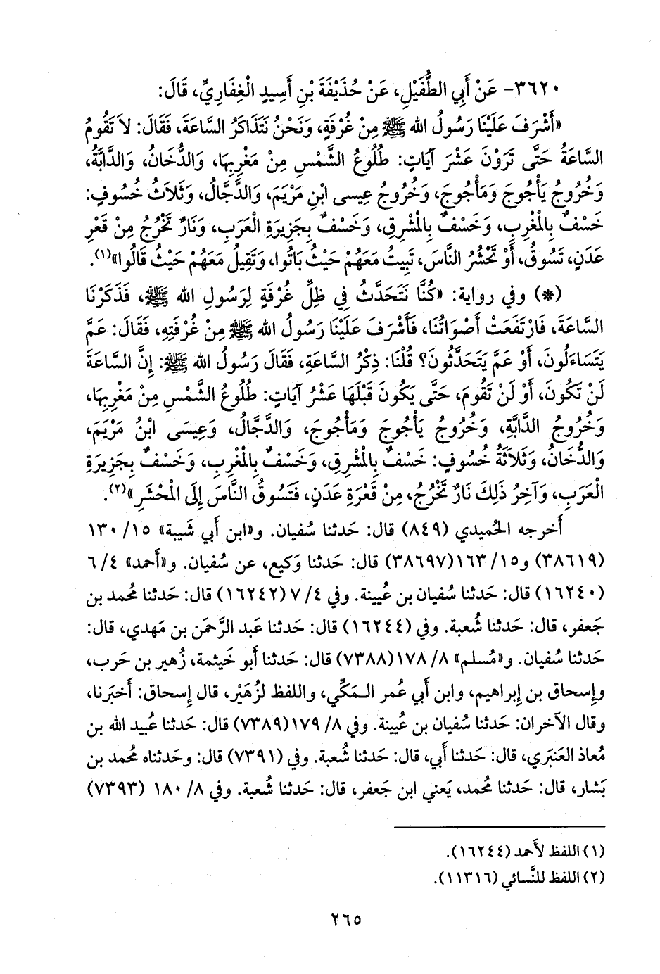 «أشرف علينا رسول الله صَلى الله عَليه وسَلم من غرفة، ونحن نتذاكر الساعة، فقال: لا تقوم الساعة حتى ترون عشر آيات: طلوع الشمس من مغربها، والدخان، والدابة، وخروج يأجوج ومأجوج، وخروج عيسى ابن مريم، والدجال، وثلاث خسوف: خسف بالمغرب، وخسف بالمشرق، وخسف بجزيرة العرب، ونار تخرج من قعر عدن، تسوق، أو تحشر الناس، تبيت معهم حيث باتوا، وتقيل معهم حيث قالوا» (¬١).