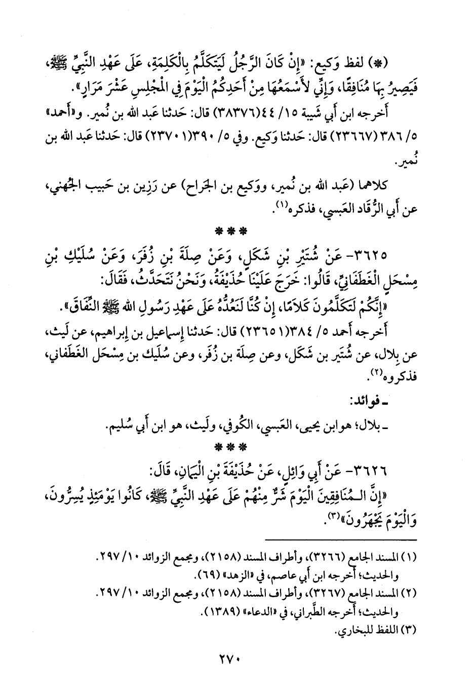 ٣٦٢٥ - عن شتير بن شكل، وعن صِلة بن زُفَر، وعن سليك بن مسحل الغطفاني، قالوا: خرج علينا حذيفة، ونحن نتحدث، فقال: