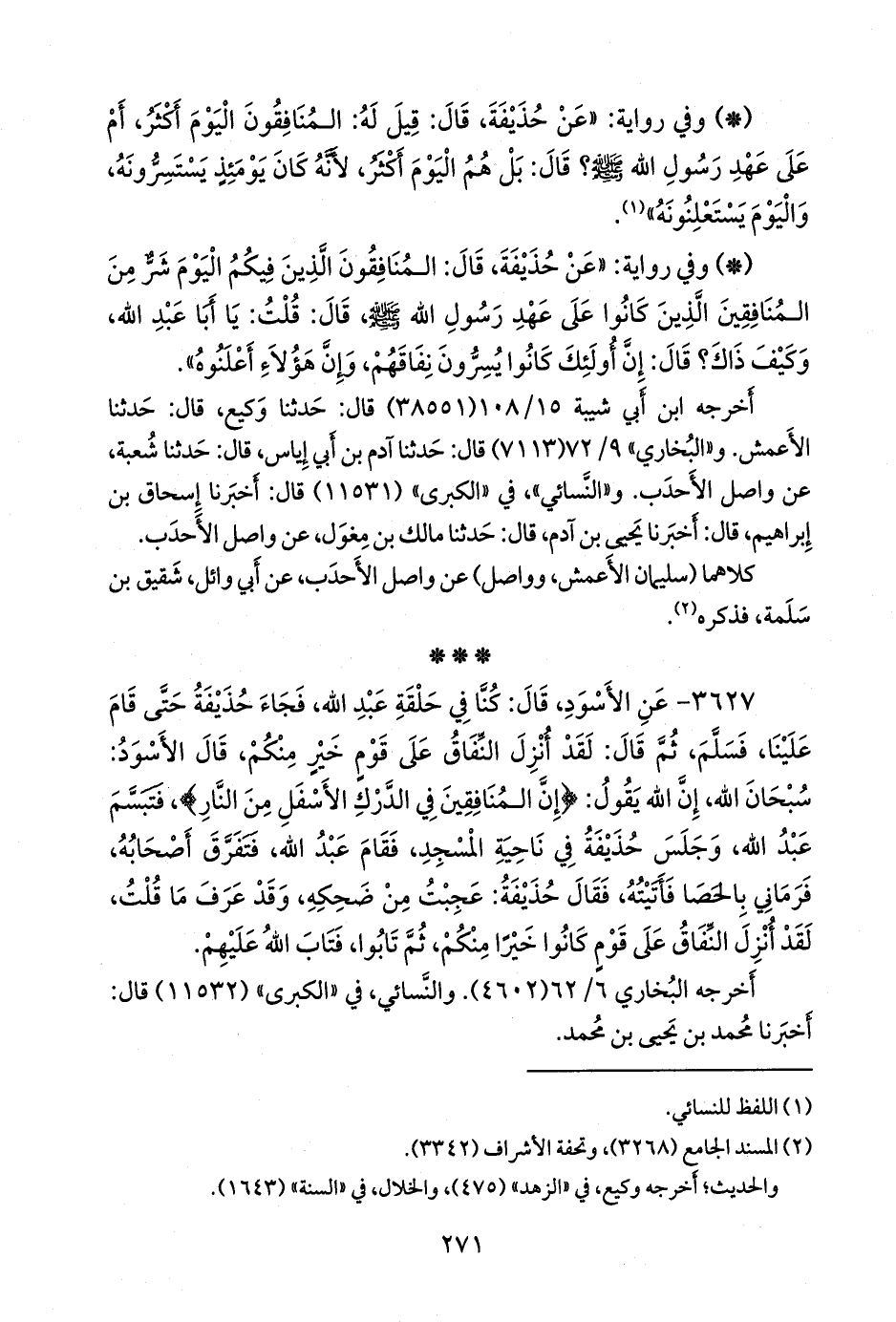 ٣٦٢٧ - عن الأَسود بن يزيد النَّخَعي، قال: كنا في حلقة عبد الله، فجاء حذيفة حتى قام علينا، فسلم، ثم قال: لقد أنزل النفاق على قوم خير منكم، قال الأسود: سبحان الله، إن الله يقول: {إن المنافقين في الدرك الأسفل من النار}، فتبسم عبد الله، وجلس حذيفة في ناحية المسجد، فقام عبد الله، فتفرق أصحابه، فرماني بالحصا فأتيته، فقال حذيفة: عجبت من ضحكه، وقد عرف ما قلت، لقد أنزل النفاق على قوم كانوا خيرًا منكم، ثم تابوا، فتاب الله عليهم (¬١).