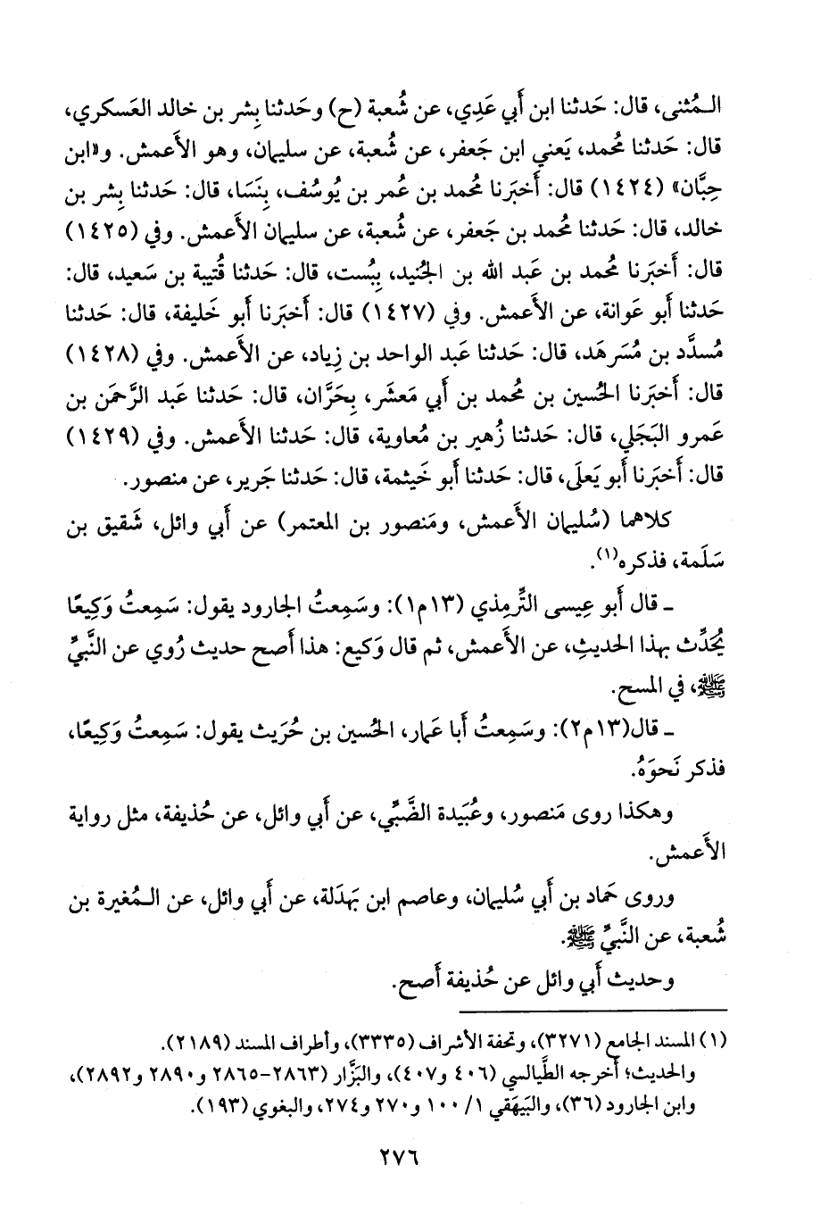وفي (١٤٢٥) قال: أخبرنا محمد بن عبد الله بن الجنيد، ببست، قال: حدثنا قتيبة بن سعيد، قال: حدثنا أَبو عَوانة، عن الأعمش. وفي (١٤٢٧) قال: أخبرنا أَبو خليفة، قال: حدثنا مُسَدد بن مُسَرهد، قال: حدثنا عبد الواحد بن زياد، عن الأعمش. وفي (١٤٢٨) قال: أخبرنا الحسين بن محمد بن أبي معشر، بحران، قال: حدثنا عبد الرَّحمَن بن عَمرو البَجَلي، قال: حدثنا زهير بن معاوية، قال: حدثنا الأعمش. وفي (١٤٢٩) قال: أخبرنا أَبو يَعلى، قال: حدثنا أَبو خيثمة، قال: حدثنا جرير، عن منصور.