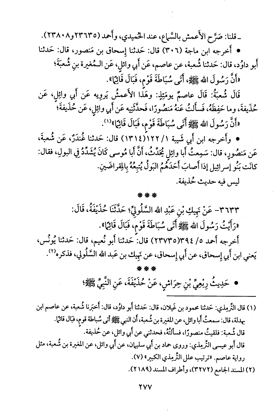 (¬١) قال التِّرمِذي: حدثنا محمود بن غَيلان، قال: حدثنا أَبو داود، قال: أخبرنا شعبة، عن عاصم بن بهدلة، قال: سمعت أبا وائل، عن المغيرة بن شعبة، أن النبي صَلى الله عَليه وسَلم أتى سباطة قوم، فبال قائما.