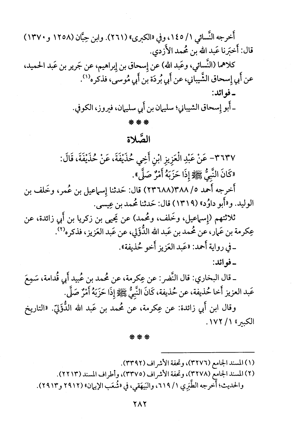 - قال البخاري: قال النضر: عن عكرمة، عن محمد بن عبيد أبي قدامة، سمع عبد العزيز أخا حذيفة، عن حذيفة، كان النبي صَلى الله عَليه وسَلم إذا حزبه أمر صلى.