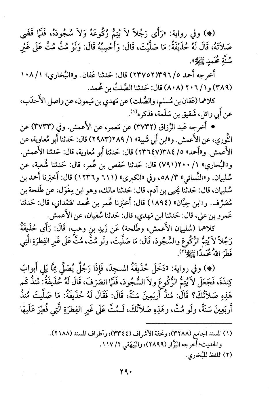 - وفي رواية: «عن زيد بن وهب، قال: رأَى حذيفة رجلا عند أَبواب كندة ينقر، فقال: مذ كم صليت هذه الصلاة؟ قال: منذ أَربعين سنة؟ قال: لو مت، مت على غير الفطرة التي فطر عليها