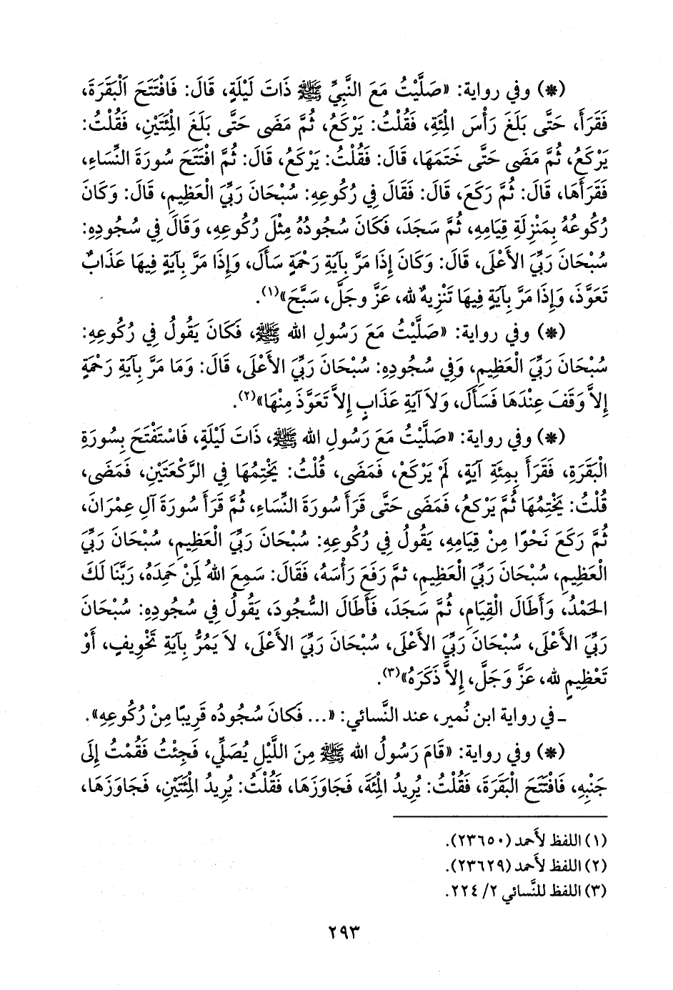 - وفي رواية: «صليت مع رسول الله صَلى الله عَليه وسَلم ذات ليلة، فاستفتح بسورة البقرة، فقرأ بمئة آية، لم يركع، فمضى، قلت: يختمها في الركعتين، فمضى، قلت: يختمها ثم يركع، فمضى حتى قرأ سورة النساء، ثم قرأ سورة آل عمران، ثم ركع نحوا من قيامه، يقول في ركوعه: سبحان ربي العظيم، سبحان ربي العظيم، سبحان ربي العظيم، ثم رفع رأسه، فقال: سمع الله لمن حمده، ربنا لك الحمد، وأطال القيام، ثم سجد، فأطال السجود، يقول في سجوده: سبحان ربي الأعلى، سبحان ربي الأعلى، سبحان ربي الأعلى، لا يمر بآية تخويف، أو تعظيم لله، عز وجل، إلا ذكره» (¬٢).