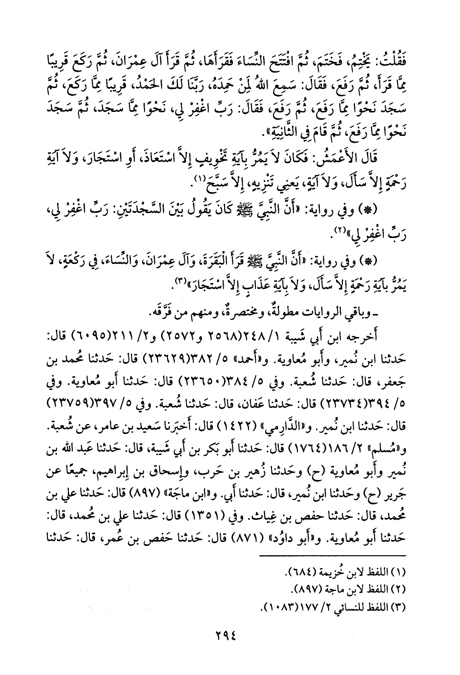 - وفي رواية: «أن النبي صَلى الله عَليه وسَلم قرأ البقرة، وآل عمران، والنساء، في ركعة، لا يمر بآية رحمة إلا سأل، ولا بآية عذاب إلا استجار» (¬٣).