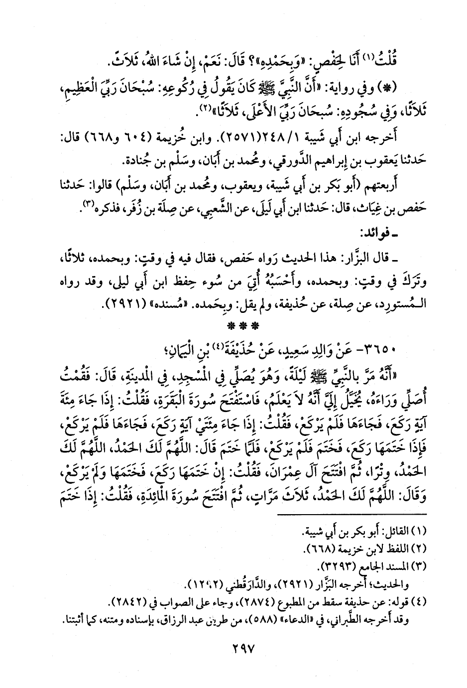 - وقال البزار: هذا الحديث رواه حفص، فقال فيه في وقت: وبحمده، ثلاثا، وترك في وقت: وبحمده، وأحسبه أُتي من سوء حفظ ابن أبي ليلى، وقد رواه المستورد، عن صلة، عن حذيفة، ولم يقل: وبحمده. «مسنده» (٢٩٢١).
