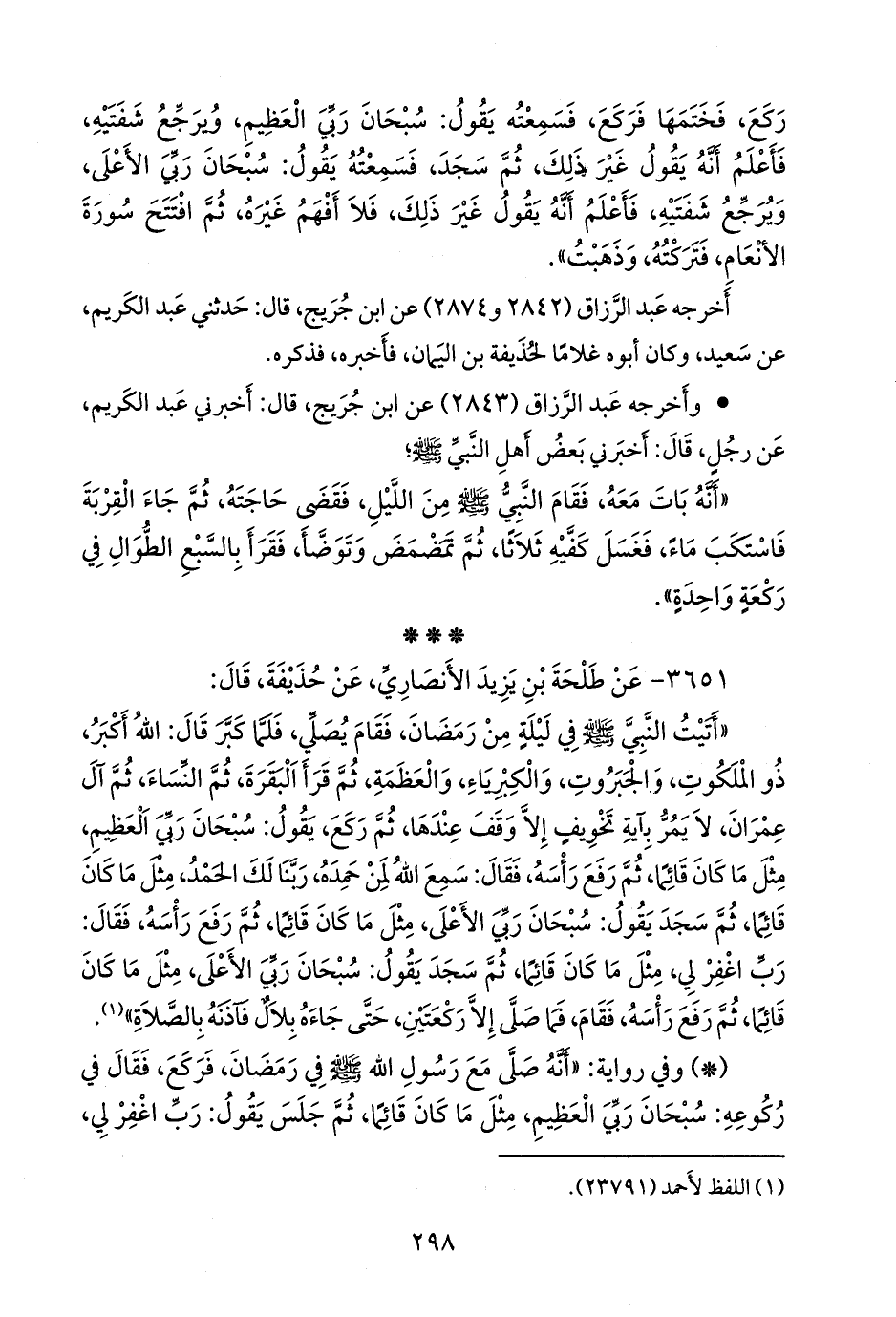 «أتيت النبي صَلى الله عَليه وسَلم في ليلة من رمضان، فقام يصلي، فلما كبر قال: الله أكبر، ذو الملكوت، والجبروت، والكبرياء، والعظمة، ثم قرأ البقرة، ثم النساء، ثم آل عمران، لا يمر بآية تخويف إلا وقف عندها، ثم ركع، يقول: سبحان ربي العظيم، مثل ما كان قائما، ثم رفع رأسه، فقال: سمع الله لمن حمده، ربنا لك الحمد، مثل ما كان قائما، ثم سجد يقول: سبحان ربي الأعلى، مثل ما كان قائما، ثم رفع رأسه، فقال: رب اغفر لي، مثل ما كان قائما، ثم سجد يقول: سبحان ربي الأعلى، مثل ما كان قائما، ثم رفع رأسه، فقام، فما صلى إلا ركعتين، حتى جاءه بلال فآذنه بالصلاة» (¬١).
