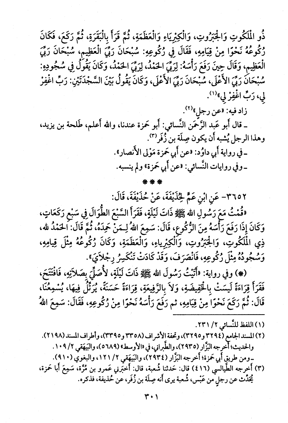 «قمت مع رسول الله صَلى الله عَليه وسَلم ذات ليلة، فقرأ السبع الطوال في سبع ركعات، وكان إذا رفع رأسه من الركوع، قال: سمع الله لمن حمده، ثم قال: الحمد لله، ذي الملكوت، والجبروت، والكبرياء، والعظمة، وكان ركوعه مثل قيامه، وسجوده مثل ركوعه، فانصرف، وقد كادت تنكسر رجلاي».
