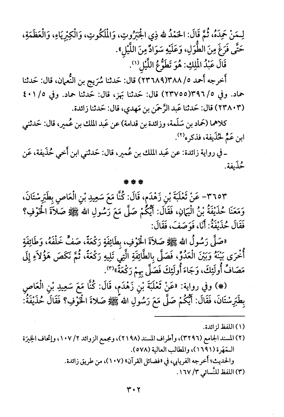 ٣٦٥٣ - عن ثعلبة بن زهدم، قال: كنا مع سعيد بن العاص بطبرستان، ومعنا حذيفة بن اليمان، فقال: أيكم صلى مع رسول الله صَلى الله عَليه وسَلم صلاة الخوف؟ فقال حذيفة: أنا، فوصف، فقال: