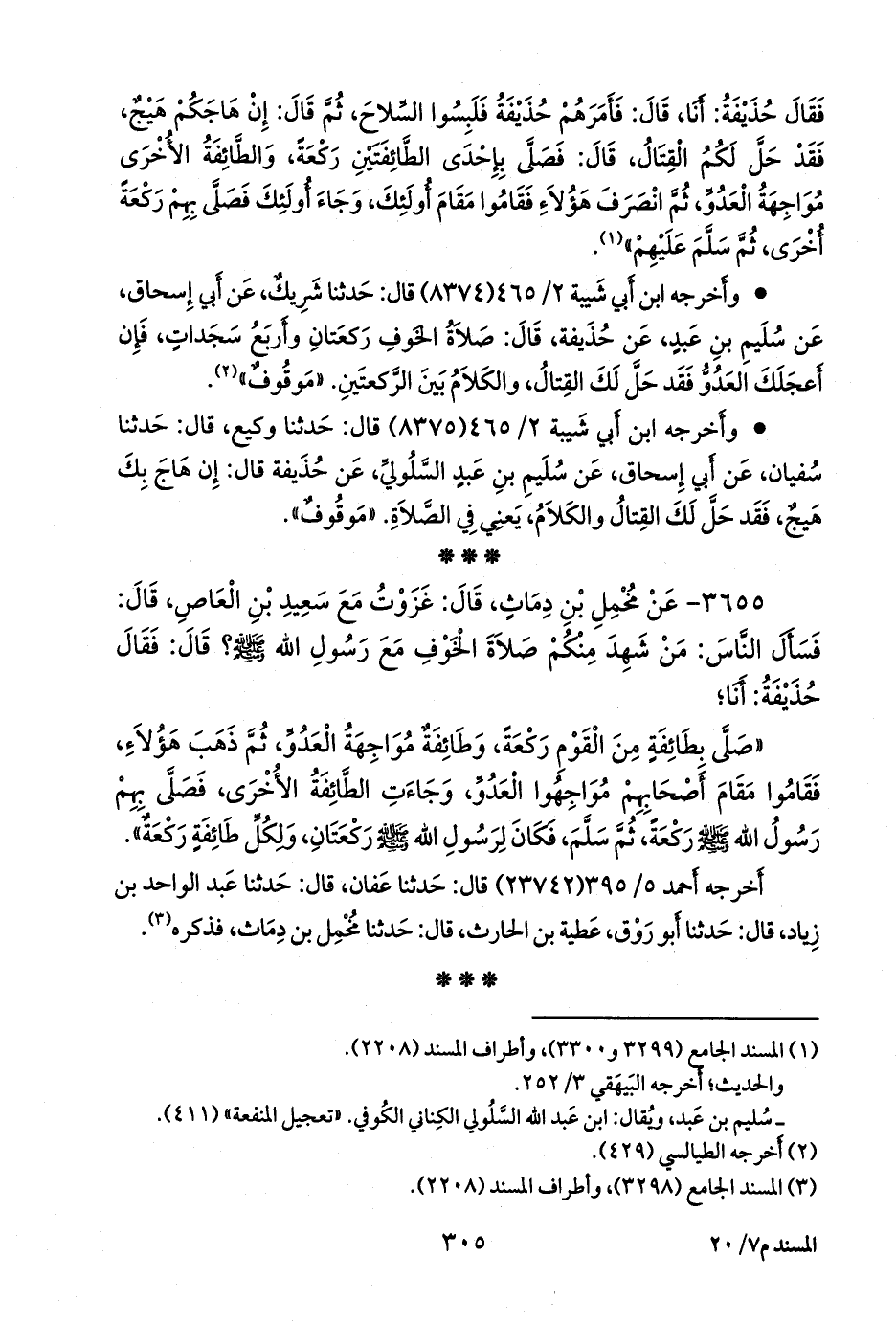 ٣٦٥٥ - عن مخمل بن دماث، قال: غزوت مع سعيد بن العاص، قال: فسأل الناس: من شهد منكم صلاة الخوف مع رسول الله صَلى الله عَليه وسَلم؟ قال: فقال حذيفة: أنا؛