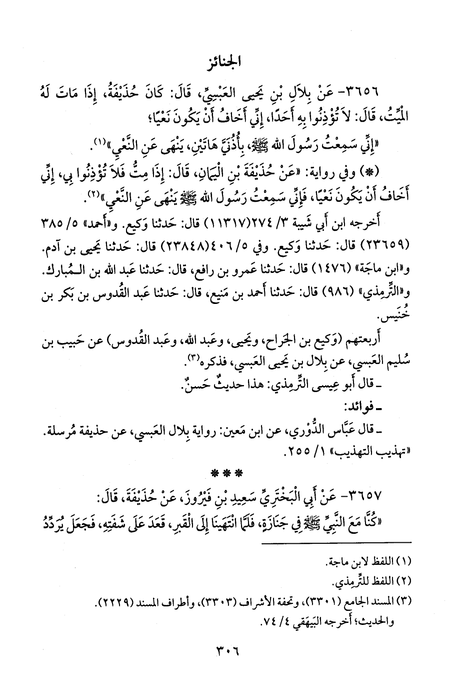 - وفي رواية: «عن حذيفة بن اليمان، قال: إذا مت فلا تؤذنوا بي، إني أخاف أن يكون نعيا، فإني سمعت رسول الله صَلى الله عَليه وسَلم ينهى عن النعي» (¬٢).