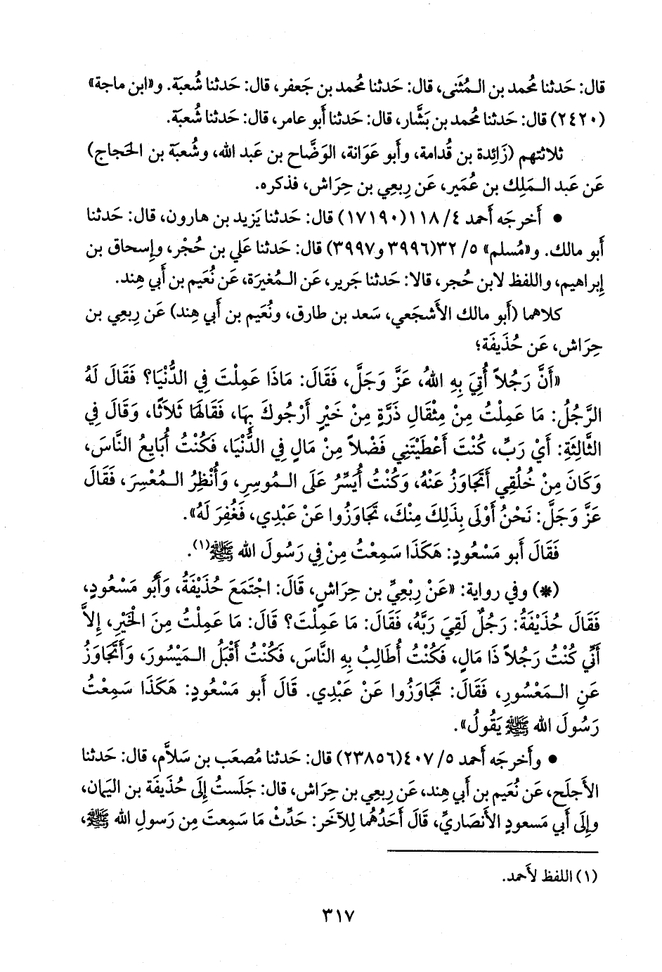 وقال نُعيم بن أَبي هند، عن رِبعي: «فأَقبل من الموسِر، وأَتجاوز عن المُعسِر».