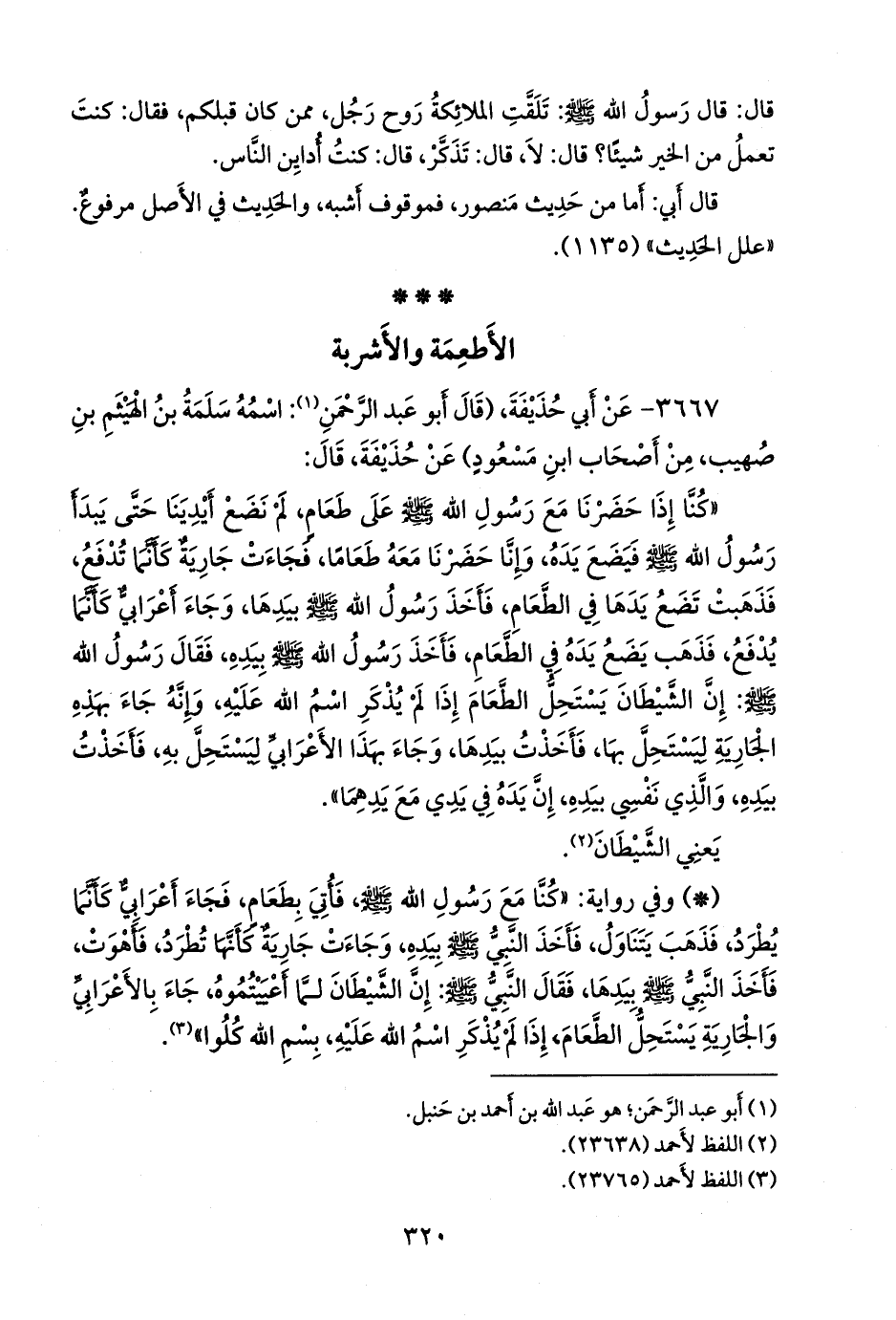 «كنا إذا حضرنا مع رسول الله صَلى الله عَليه وسَلم على طعام، لم نضع أيدينا حتى يبدأ رسول الله صَلى الله عَليه وسَلم فيضع يده، وإنا حضرنا معه طعاما، فجاءت جارية كأنما تدفع، فذهبت تضع يدها في الطعام، فأخذ رسول الله صَلى الله عَليه وسَلم بيدها، وجاء أعرابي كأنما يدفع، فذهب يضع يده في الطعام، فأخذ رسول الله صَلى الله عَليه وسَلم بيده، فقال رسول الله صَلى الله عَليه وسَلم: إن الشيطان يستحل الطعام إذا لم يذكر اسم الله عليه، وإنه جاء بهذه الجارية ليستحل بها، فأخذت بيدها، وجاء بهذا الأعرابي ليستحل به، فأخذت بيده، والذي نفسي بيده، إن يده في يدي مع يدهما».