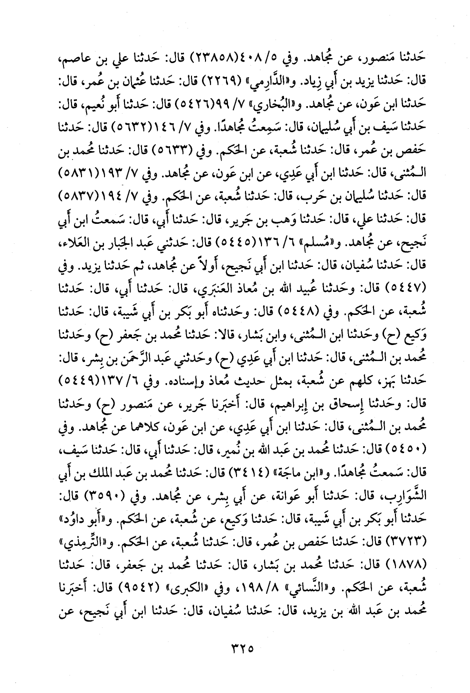 مجاهد، ويزيد بن أبي زياد. وفي «الكبرى» (٦٥٩٧) قال: أخبرنا يحيى بن مخلد البغدادي، قال: حدثني المعافى، وهو ابن عمران الموصلي، عن سيف، وهو ابن سليمان المكي، قال: سمعت مجاهدا يحدث. وفي (٦٨٤١) قال: أخبرنا حميد بن مَسعَدة، قال: حدثنا يزيد بن زُريع، قال: حدثنا عبد الله بن عون، عن مجاهد. وفي (٦٨٤٢) قال: أخبرنا إسحاق بن إبراهيم، قال: أخبرنا جرير، عن منصور، أحسبه عن مجاهد. و «ابن حِبَّان» (٥٣٣٩) قال: أخبرنا الفضل بن الحُبَاب، قال: حدثنا إبراهيم بن بشار الرمادي، قال: حدثنا سفيان، قال: كان حدثنا به أولا ابن أَبي نَجيح، عن مجاهد، ثم سمعته من يزيد بن أبي زياد.