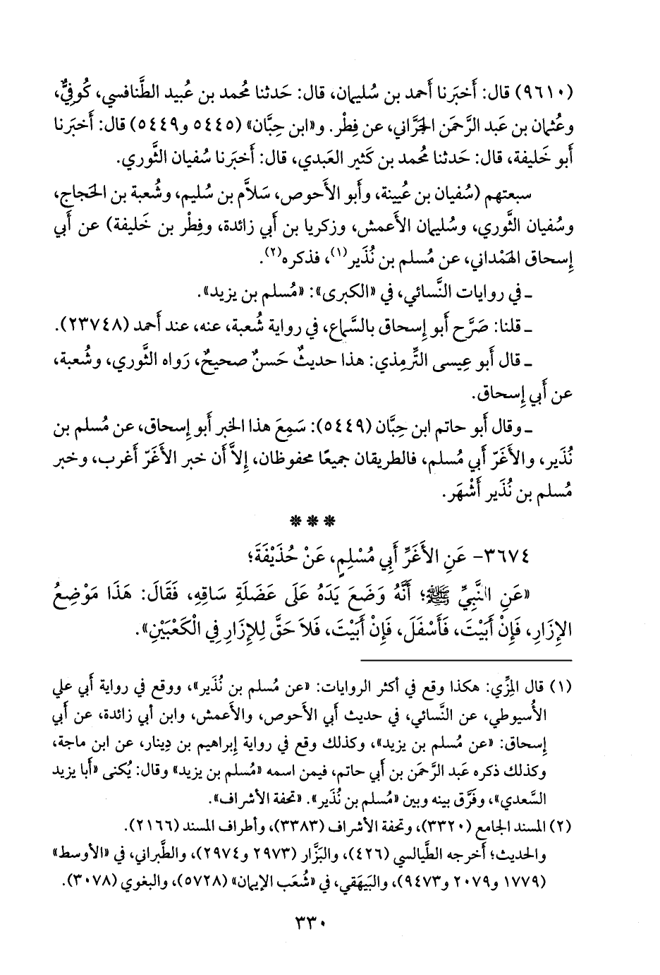 - قال أَبو حاتم بن حِبَّان (٥٤٤٩): سمع هذا الخبر أَبو إِسحاق، عن مسلم بن نُذَير، والأَغرّ أَبي مسلم، فالطريقان جميعًا محفوظان، إِلا أَن خبر الأَغرّ أَغرَب، وخبر مسلم بن نُذَير أَشهَر.