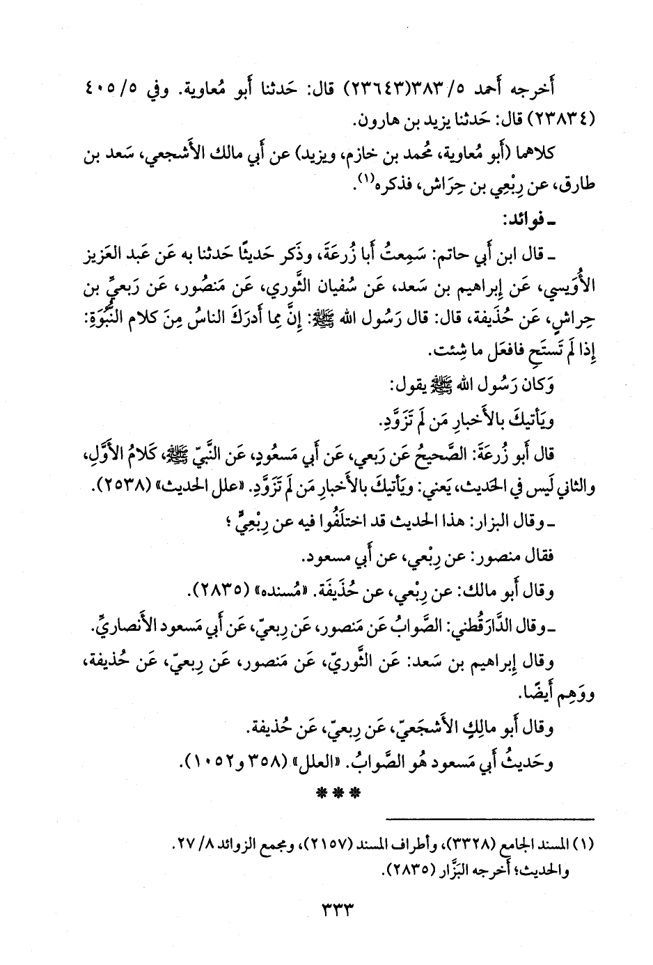 - وقال ابن عبد البَرِّ: هذا الحديث خطأ ويقولون: إن الخطأ فيه من أَبي مالك الأشجعي، ورواية منصور عندهم صواب، رواها شعبة، والثوري، وشريك، وغيرهم، عن منصور، عن ربعي، عن أَبي مسعود الأنصاري، ولا يصح في هذا الحديث عندهم غير هذا الإسناد، وإنما هو لرِبعي بن حِراش، عن أَبي مسعود الأنصاري، عقبة بن عَمرو، عن النبي صَلى الله عَليه وسَلم وليس لربعي، عن حذيفة. «التمهيد» ٢٠/ ٦٨.