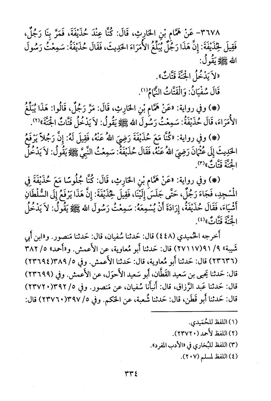 - وفي رواية: «عن همام بن الحارث، قال: كنا جلوسا مع حذيفة في المسجد، فجاء رجل، حتى جلس إلينا، فقيل لحذيفة: إن هذا يرفع إلى السلطان أشياء، فقال حذيفة، إرادة أن يسمعه: سمعت رسول الله صَلى الله عَليه وسَلم يقول: لا يدخل الجنة قتات» (¬٤).