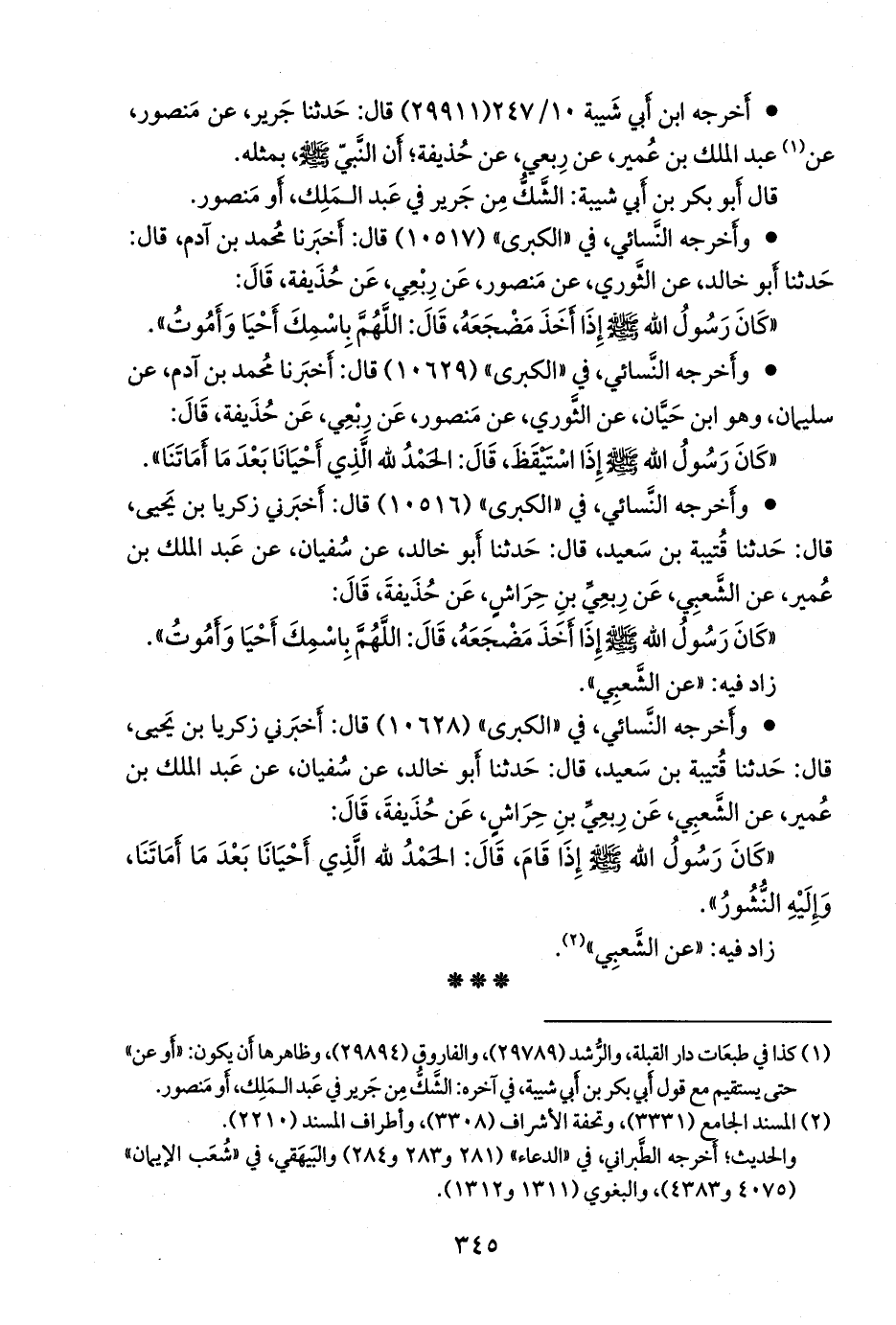 (¬١) في طبعات دار القِبلة والرشد والفاروق: «منصور عن»، وهو على الصواب في طبعة إشبيليا، وهو ما يستقيم مع قول أبي بكر بن أبي شيبة في آخره: الشك من جَرير في عبد الملك، أَو منصور.