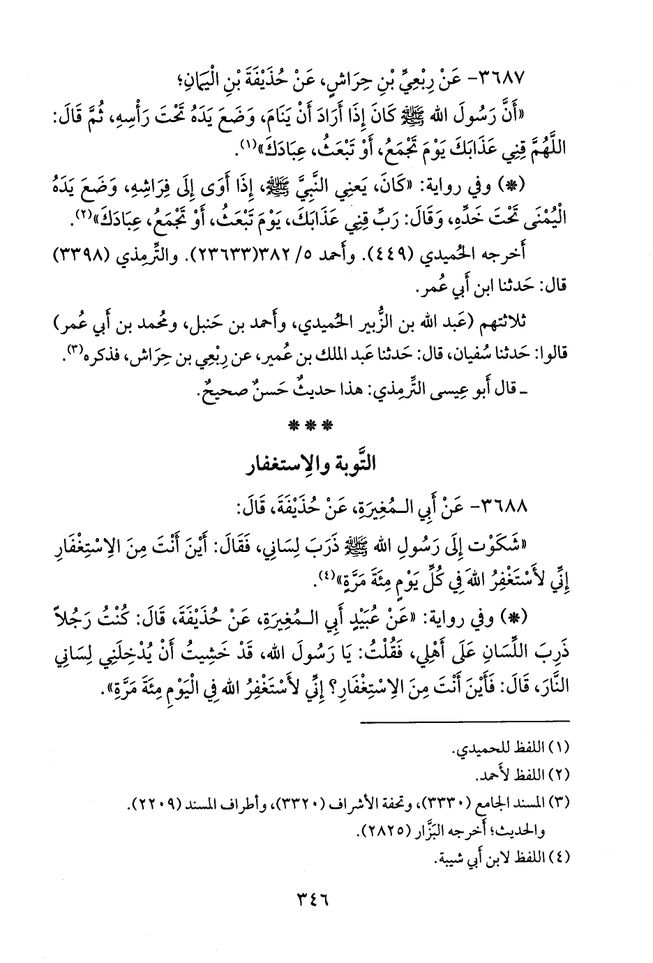 - وفي رواية: «عن عبيد أبي المغيرة، عن حذيفة، قال: كنت رجلا ذرب اللسان على أهلي، فقلت: يا رسول الله، قد خشيت أن يدخلني لساني النار، قال: فأين أنت من الاستغفار؟ إني لأستغفر الله في اليوم مئة مرة».
