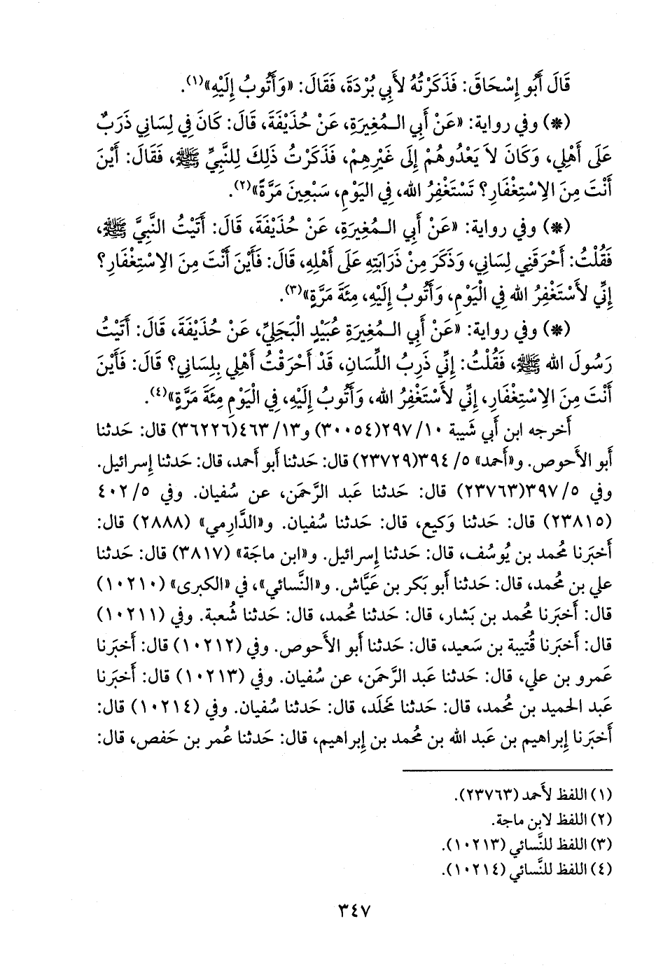 - وفي رواية: «عن أبي المغيرة عُبيد البَجَلي، عن حذيفة، قال: أتيت رسول الله صَلى الله عَليه وسَلم فقلت: إني ذرب اللسان، قد أحرقت أهلي بلساني؟ قال: فأين أنت من الاستغفار، إني لأستغفر الله، وأتوب إليه، في اليوم مئة مرة» (¬١).