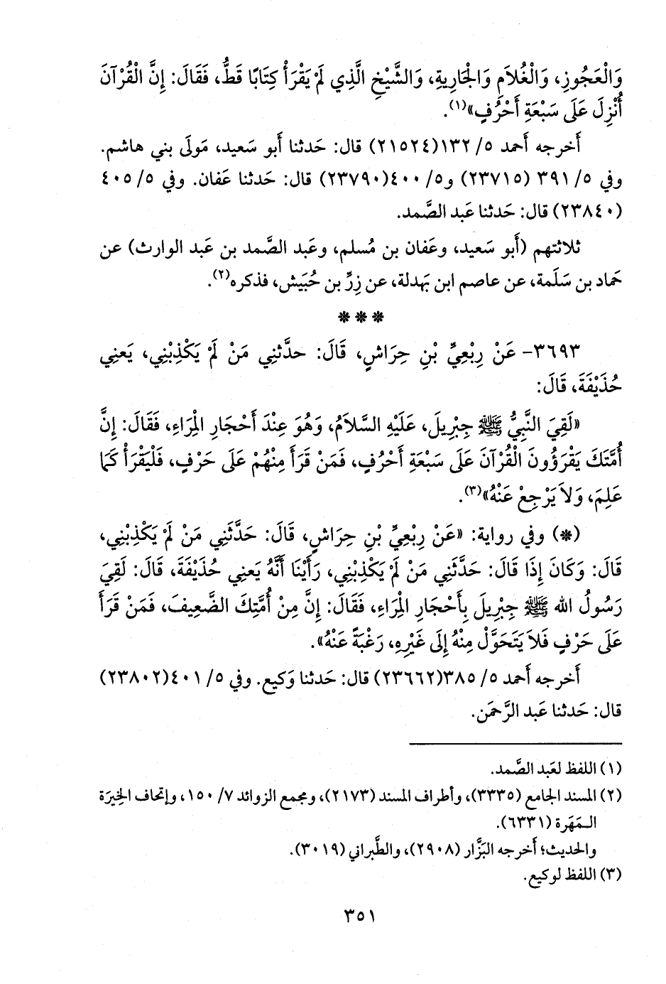- وفي رواية: «عن رِبعي بن حِراش، قال: حدثني من لم يكذبني، قال: وكان إذا قال: حدثني من لم يكذبني، رأينا أنه يعني حذيفة، قال: لقي رسول الله صَلى الله عَليه وسَلم جبريل بأحجار المراء، فقال: إن من أمتك الضعيف، فمن قرأ على حرف فلا يتحول منه إلى غيره، رغبة عنه».