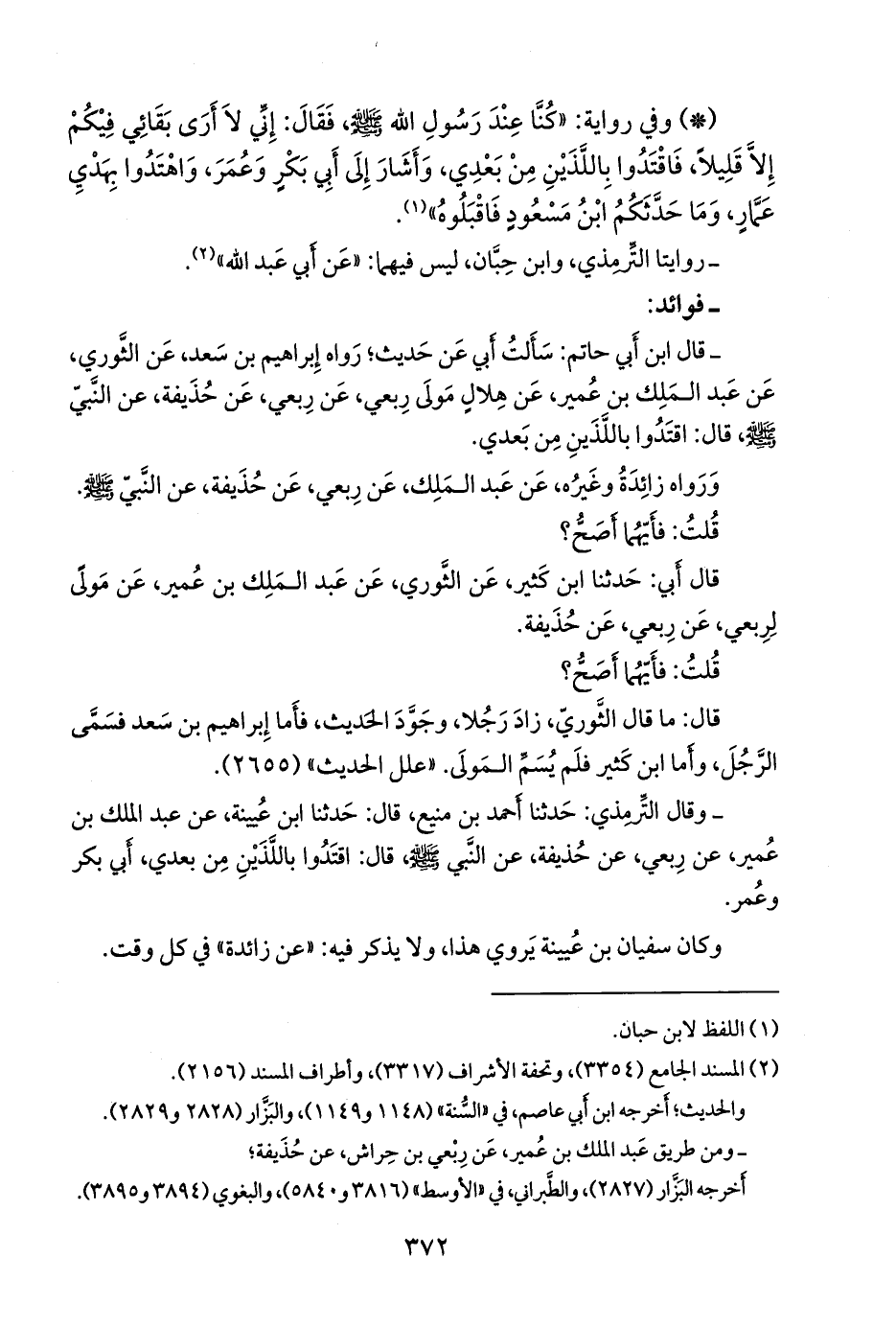 - وقال التِّرمِذي: حدثنا أحمد بن مَنيع، قال: حدثنا ابن عُيينة، عن عبد الملك بن عمير، عن رِبعي، عن حذيفة، عن النبي صَلى الله عَليه وسَلم قال: اقتدوا باللذين من بعدي، أَبي بكر وعمر.