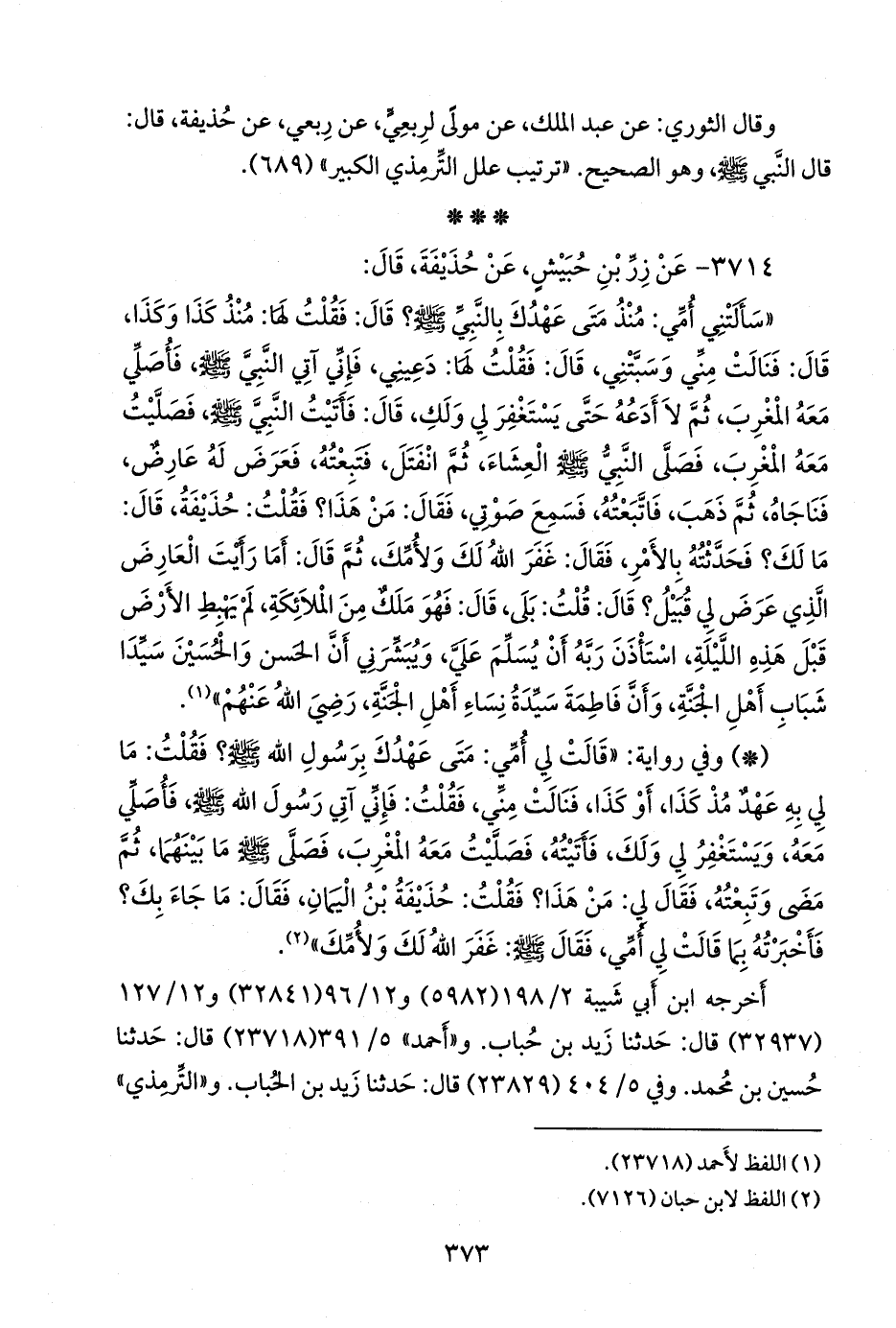 «سألتني أمي: منذ متى عهدك بالنبي صَلى الله عَليه وسَلم؟ قال: فقلت لها: منذ كذا وكذا، قال: فنالت مني وسبتني، قال: فقلت لها: دعيني، فإني آتي النبي صَلى الله عَليه وسَلم فأصلي معه المغرب، ثم لا أدعه حتى يستغفر لي ولك، قال: فأتيت النبي صَلى الله عَليه وسَلم فصليت معه المغرب، فصلى النبي صَلى الله عَليه وسَلم العشاء، ثم انفتل، فتبعته، فعرض له عارض، فناجاه، ثم ذهب، فاتبعته، فسمع صوتي، فقال: من هذا؟ فقلت: حذيفة، قال: ما لك؟ فحدثته بالأمر، فقال: غفر الله لك ولأمك، ثم قال: أما رأيت العارض الذي عرض لي قبيل؟ قال: قلت: بلى، قال: فهو ملك من الملائكة، لم يهبط الأرض قبل هذه الليلة، استأذن ربه أن يسلم علي، ويبشرني أن الحسن والحسين سيدا شباب أهل الجنة، وأن فاطمة سيدة نساء أهل الجنة، رضي الله عنهم» (¬١).