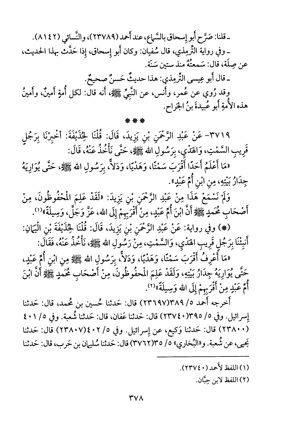 ٣٧١٩ - عن عبد الرَّحمَن بن يزيد النَّخَعي، قال: قلنا لحذيفة: أخبرنا برجل قريب السمت، والهدي، برسول الله صَلى الله عَليه وسَلم حتى نأخذ عنه، قال: