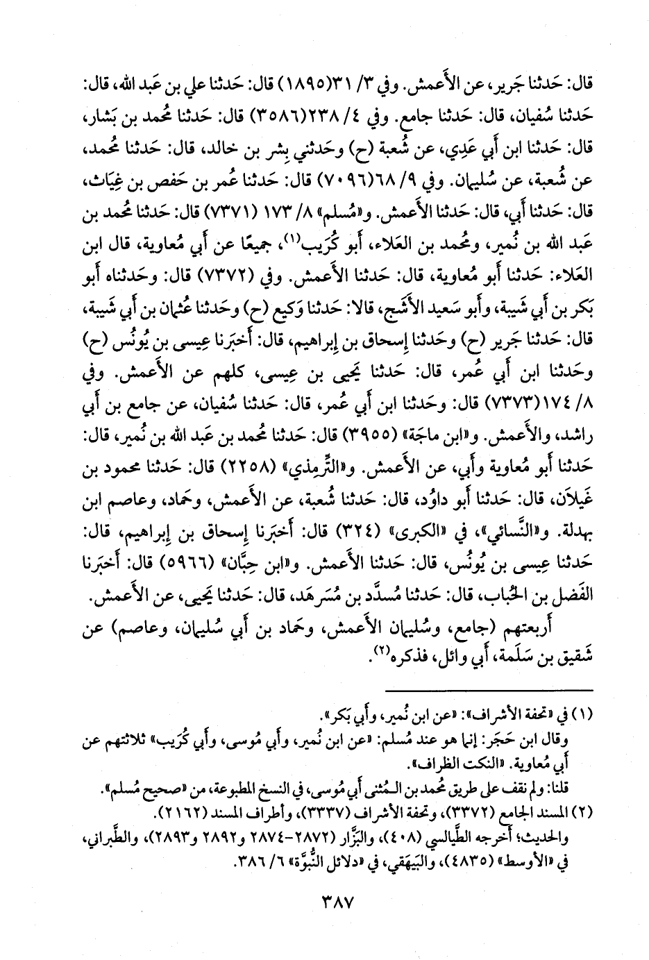 وفي (٧٣٧٢) قال: وحدثناه أَبو بكر بن أبي شيبة، وأَبو سعيد الأشج، قالا: حدثنا وكيع (ح) وحدثنا عثمان بن أبي شيبة، قال: حدثنا جَرير (ح) وحدثنا إسحاق بن إبراهيم، قال: أخبرنا عيسى بن يونس (ح) وحدثنا ابن أبي عمر، قال: حدثنا يحيى بن عيسى، كلهم عن الأعمش. وفي ٨/ ١٧٤ (٧٣٧٣) قال: وحدثنا ابن أبي عمر، قال: حدثنا سفيان، عن جامع بن أبي راشد، والأعمش. و «ابن ماجة» (٣٩٥٥) قال: حدثنا محمد بن عبد الله بن نُمير، قال: حدثنا أَبو معاوية وأبي، عن الأعمش. و «التِّرمِذي» (٢٢٥٨) قال: حدثنا محمود بن غَيلان، قال: حدثنا أَبو داود، قال: حدثنا شعبة، عن الأعمش، وحماد، وعاصم بن بهدلة. و «النَّسَائي» في «الكبرى» (٣٢٤) قال: أخبرنا إسحاق بن إبراهيم، قال: حدثنا عيسى بن يونس، قال: حدثنا الأعمش. و «ابن حِبَّان» (٥٩٦٦) قال: أخبرنا الفضل بن الحُبَاب، قال: حدثنا مُسَدد بن مُسَرهد، قال: حدثنا يحيى، عن الأعمش.