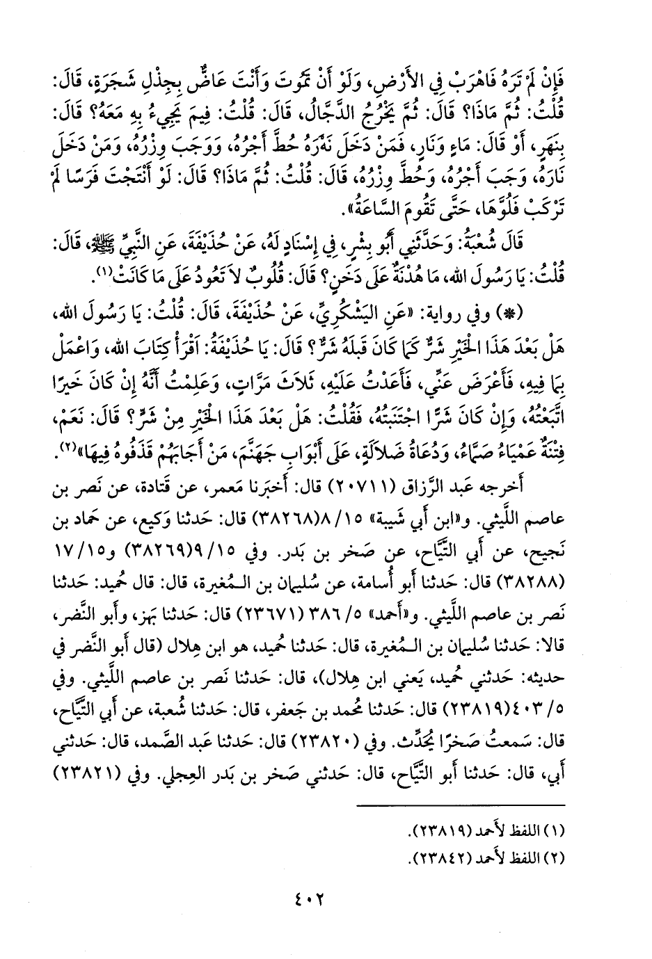 قال: حدثنا يونس، قال: حدثنا حماد، عن أبي التياح، عن صخر. وفي (٢٣٨٢٢) قال: حدثنا عبد الرزاق، قال: أنبأنا معمر، عن قتادة، عن نصر بن عاصم الليثي. وفي ٥/ ٤٠٤ (٢٣٨٢٤) قال: حدثنا بَهز، قال: حدثنا أَبو عَوانة، قال: حدثنا قتادة، عن نصر بن عاصم. وفي ٥/ ٤٠٦ (٢٣٨٤٢) قال: حدثنا عبد الصمد، قال: حدثنا حماد، قال: حدثنا علي بن زيد. و «أَبو داود» (٤٢٤٤) قال: حدثنا مُسدد، وقتيبة بن سعيد، دخل حديث أحدهما في الآخر، قالا: حدثنا أَبو عَوانة، عن قتادة، عن نصر بن عاصم. وفي (٤٢٤٥) قال: حدثنا محمد بن يحيى بن فارس، قال: حدثنا عبد الرزاق، عن مَعمَر، عن قتادة، عن نصر بن عاصم. وفي (٤٢٤٦) قال: حدثنا عبد الله بن مَسلَمة القَعنَبي، قال: حدثنا سليمان، يعني ابن المغيرة، عن حميد، عن نصر بن عاصم الليثي.