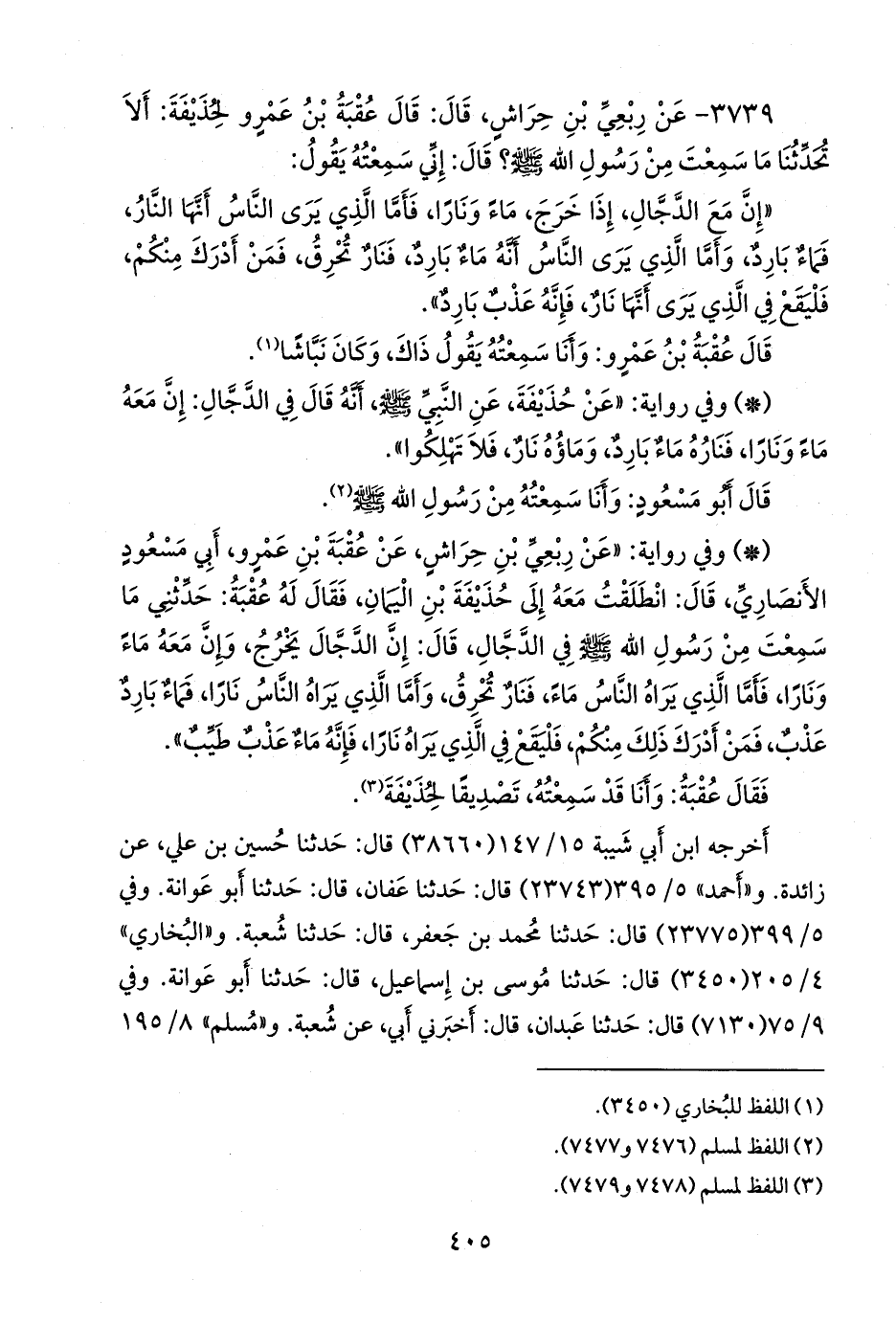 - وفي رواية: «عن رِبعي بن حِراش، عن عقبة بن عَمرو أبي مسعود الأَنصاري، قال: انطلقت معه إلى حذيفة بن اليمان، فقال له عقبة: حدثني ما سمعت من رسول الله صَلى الله عَليه وسَلم في الدجال، قال: إن الدجال يخرج، وإن معه ماء ونارا، فأما الذي يراه الناس ماء، فنار تحرق، وأما الذي يراه الناس نارا، فماء بارد عذب، فمن أدرك ذلك منكم، فليقع في الذي يراه نارا، فإنه ماء عذب طيب».