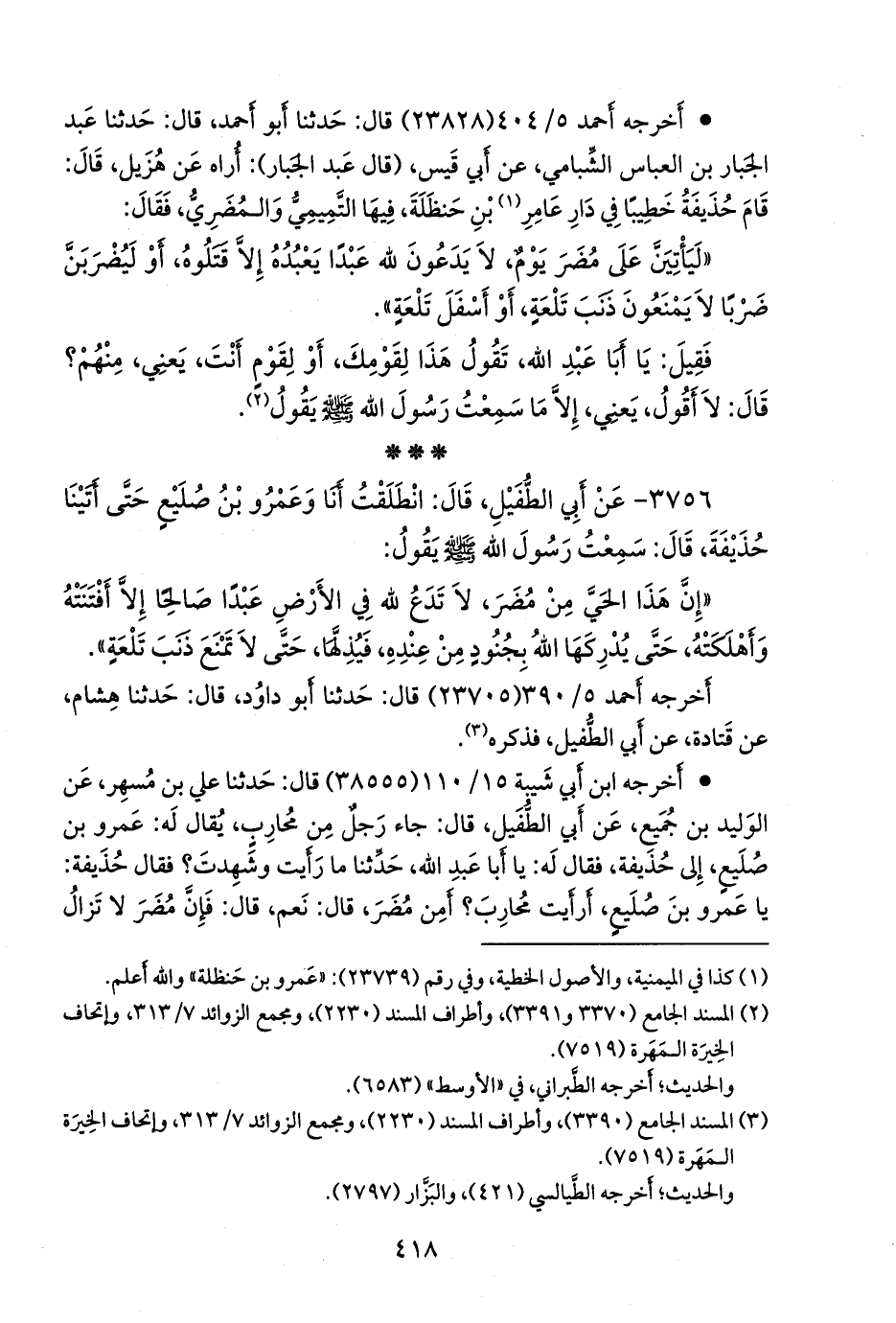 ٣٧٥٦ - عن أبي الطفيل، قال: انطلقت أنا وعَمرو بن صليع حتى أتينا حذيفة، قال: سمعت رسول الله صَلى الله عَليه وسَلم يقول: