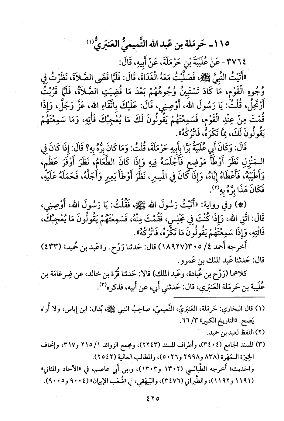 كلاهما (روح بن عبادة، وعبد الملك) عن قرة بن خالد، عن ضرغامة بن عليبة بن حَرملة العنبري، قال: حدثني أبي، عن أبيه، فذكره (¬٣).