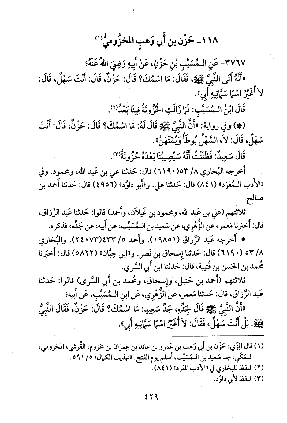 (¬١) قال المِزِّي: حزن بن أبي وهب بن عَمرو بن عائذ بن عمران بن مخزوم، القرشي، المخزومي، المكي، جد سعيد بن المُسَيب، أسلم يوم الفتح. «تهذيب الكمال» ٥/ ٥٩١.