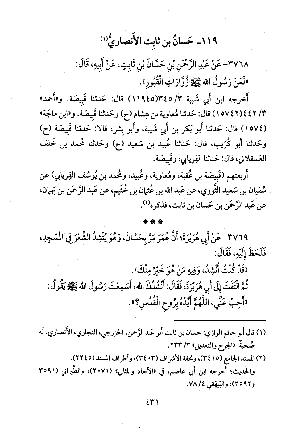 (¬١) قال أَبو حاتم الرازي: حسان بن ثابت أَبو عبد الرَّحمَن، الخزرجي، النجاري، الأَنصاري، له صحبة. «الجرح والتعديل» ٣/ ٢٣٣.