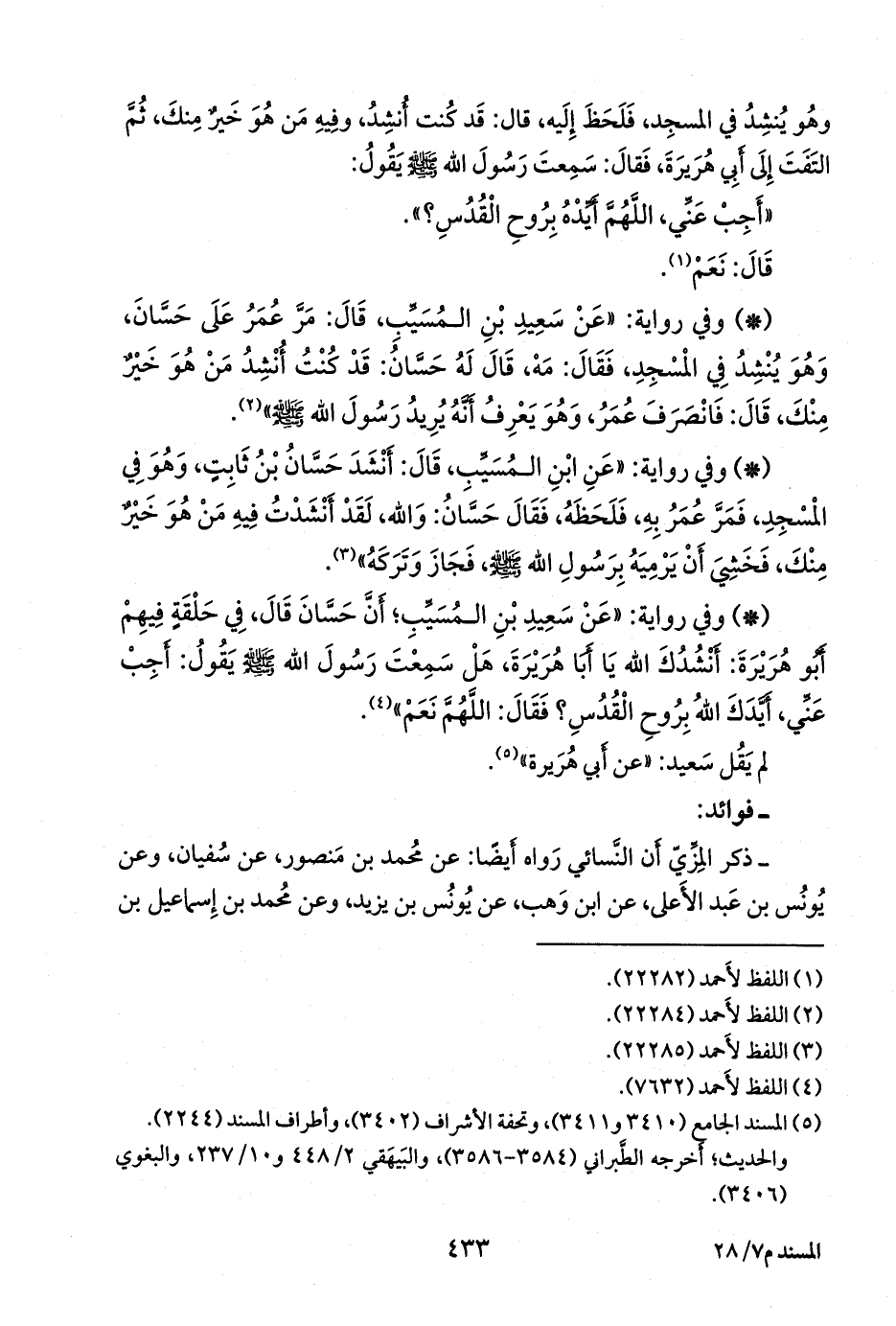 - وفي رواية: «عن سعيد بن المُسَيب؛ أن حسان قال، في حلقة فيهم أَبو هريرة: أنشدك الله يا أبا هريرة، هل سمعتَ رسول الله صَلى الله عَليه وسَلم يقول: أجب عني، أيدك الله بروح القدس؟ فقال: اللهم نعم» (¬٣).