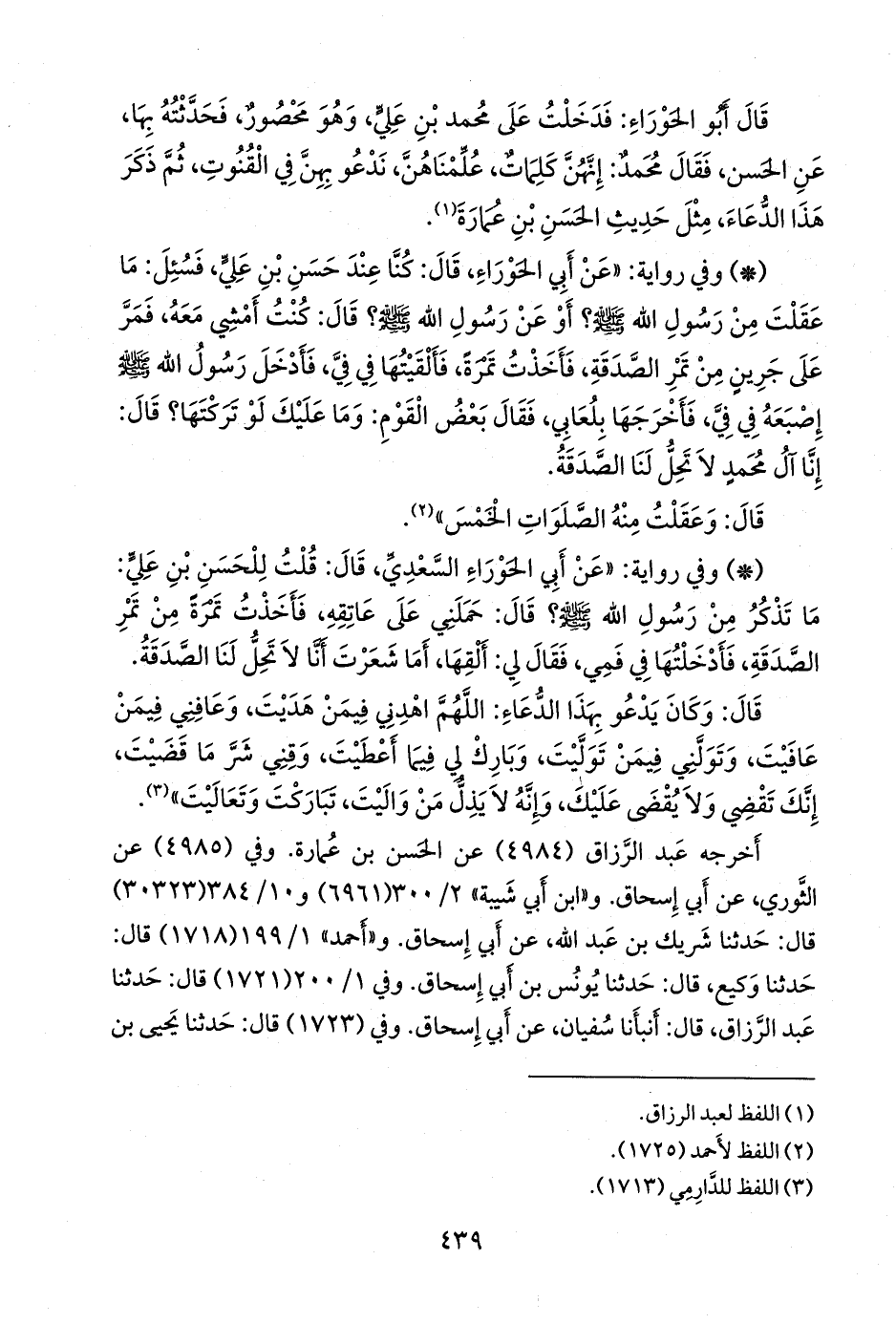 سعيد، عن شعبة. وفي (١٧٢٥) قال: حدثنا أَبو أحمد، هو الزُّبَيري، قال: حدثنا العلاء بن صالح. وفي (١٧٢٧) قال: حدثنا محمد بن جعفر، قال: حدثنا شعبة. و «الدَّارِمي» (١٧١٣) قال: حدثنا عثمان بن عمر، قال: حدثنا شعبة. وفي (١٧١٤) قال: أخبرنا عُبيد الله بن موسى، عن إسرائيل، عن أبي إسحاق. وفي (١٧١٥) قال: أخبرنا يحيى بن حسان، قال: حدثني أَبو الأحوص، عن أبي إسحاق. وفي (٢٦٩٢) قال: أخبرنا سعيد بن عامر، قال: حدثنا شعبة. و «ابن ماجة» (١١٧٨) قال: حدثنا أَبو بكر بن أبي شيبة، قال: حدثنا شَريك، عن أبي إسحاق. و «أَبو داود» (١٤٢٥) قال: حدثنا قتيبة بن سعيد، وأحمد بن جواس الحنفي، قالا: حدثنا أَبو الأحوص، عن أبي إسحاق. وفي (١٤٢٦) قال: حدثنا عبد الله بن محمد النفيلي، قال: حدثنا زهير، قال: حدثنا أَبو إسحاق بإسناده ومعناه.