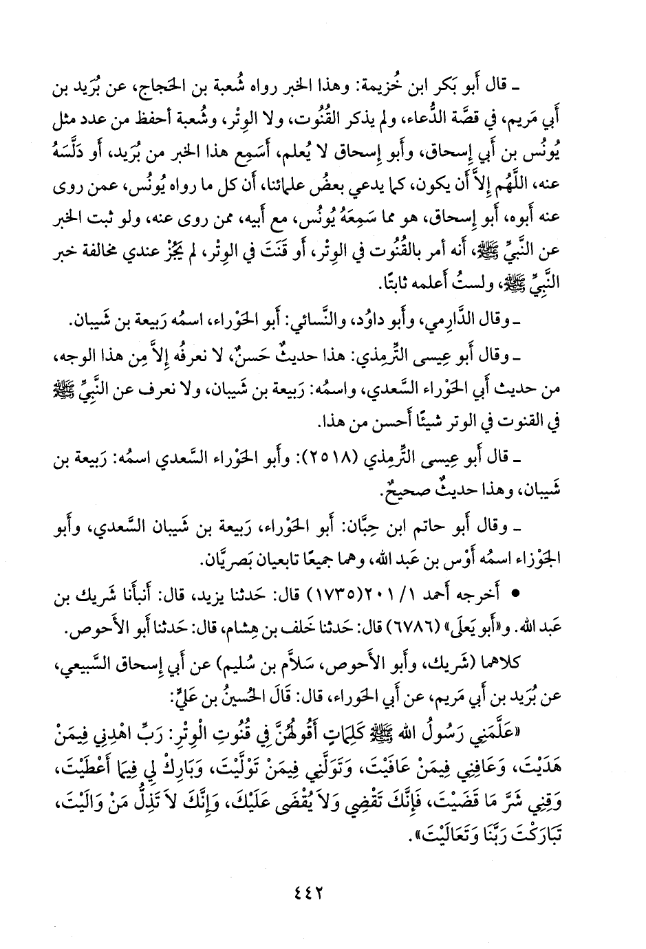 - وقال التِّرمِذي: هذا حديثٌ حسنٌ، لا نعرفه إلا من هذا الوجه، من حديث أبي الحوراء السعدي، واسمه: ربيعة بن شَيبان، ولا نعرف عن النبي صَلى الله عَليه وسَلم في القنوت في الوتر شيئًا أحسن من هذا.