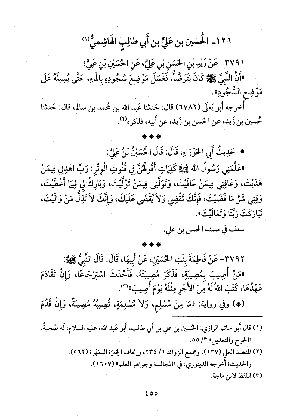 (¬١) قال أَبو حاتم الرازي: الحسين بن علي بن أبي طالب، أَبو عبد الله، عليه السلام، له صحبة. «الجرح والتعديل» ٣/ ٥٥.